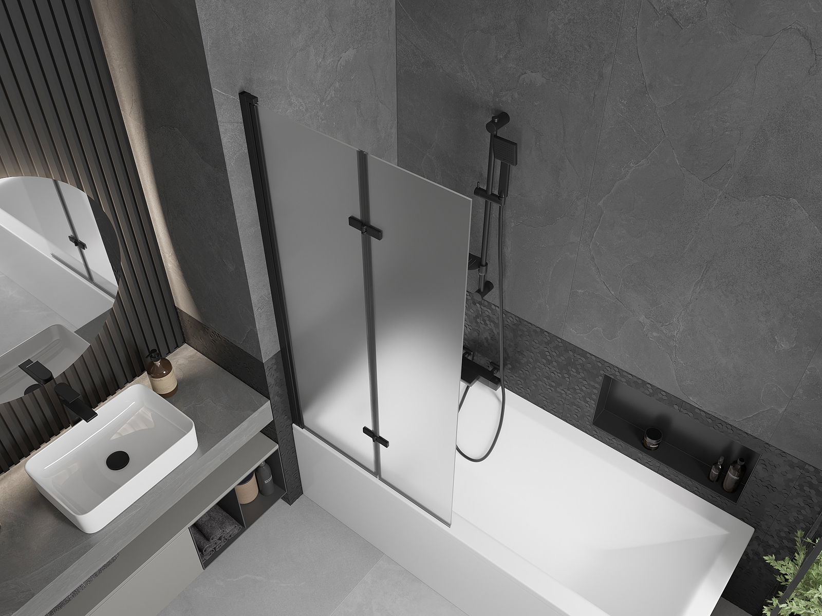 Paravent composé de deux battants pouvant être repliés. Cette solution permet d'économiser plus d'espace dans la salle de bain et de profiter librement du reste de l'espace lorsque nous n'utilisons pas la zone de bain.