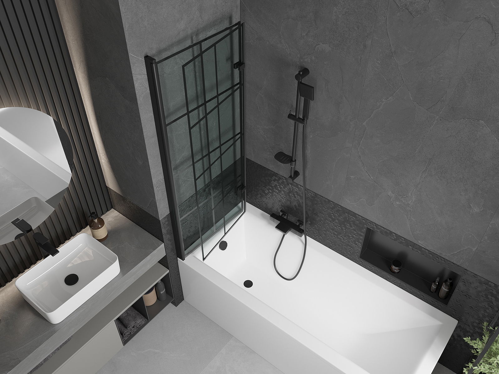 Paravent composé de deux battants pouvant être repliés. Cette solution permet d'économiser plus d'espace dans la salle de bain et de profiter librement du reste de l'espace lorsque nous n'utilisons pas la zone de bain.