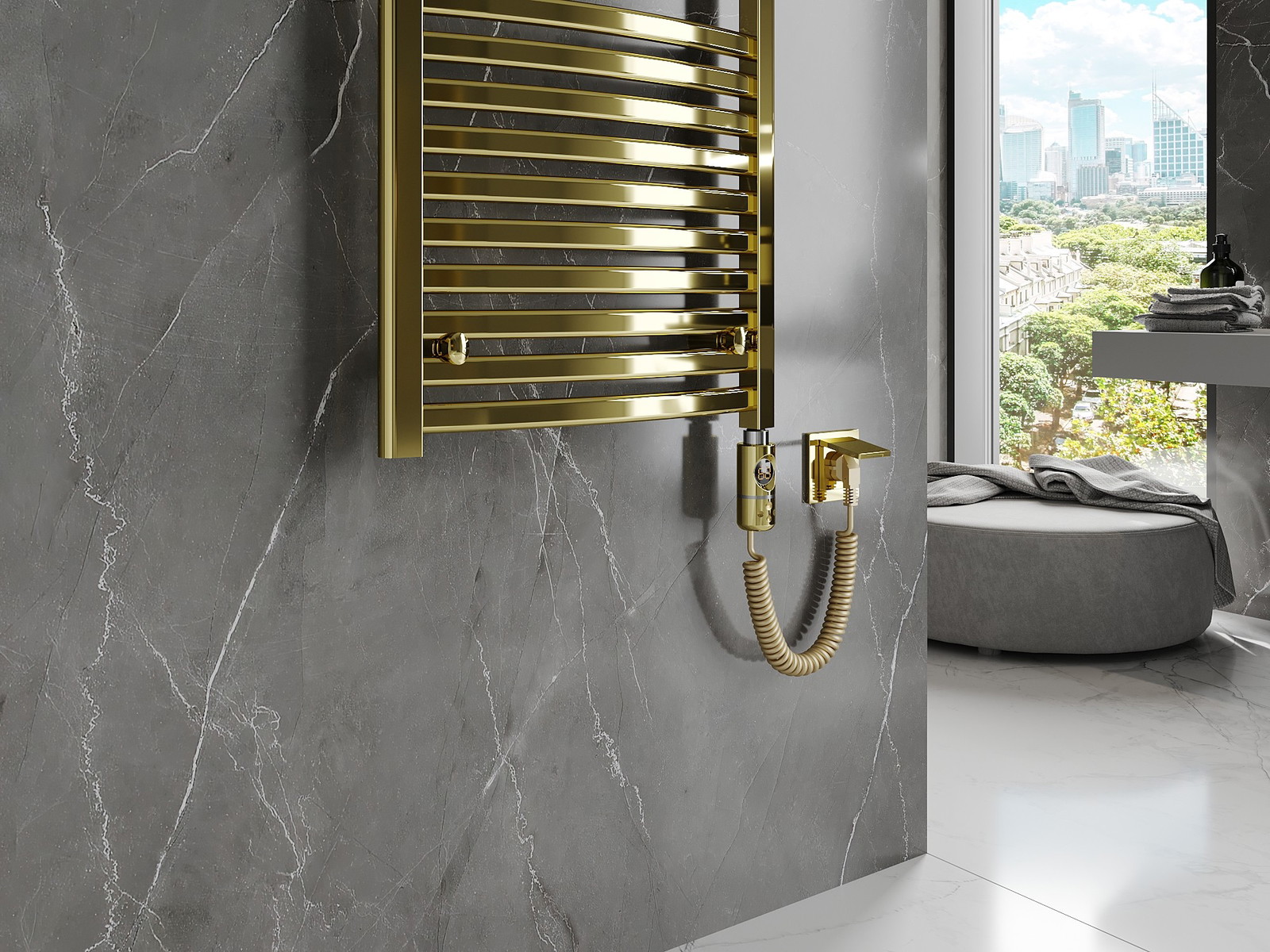Mexen Helios est un radiateur électrique doré exceptionnel qui combine un design élégant et fonctionnalité. Avec des dimensions de 800x500 mm et une puissance de 300 W, il s'adapte parfaitement aux intérieurs modernes. Grâce à ses 15 barres chauffantes et à son thermostat intégré, il assure une température optimale. L'acier solide et le revêtement de peinture durable garantissent une résistance à la corrosion. Le contrôle tactile avec affichage LED et les fonctions telles que Sensitive et Comfort augmentent le confort d'utilisation. La sécurité est assurée par IP44 et la protection contre le fonctionnement à sec. Un kit de montage complet est inclus.