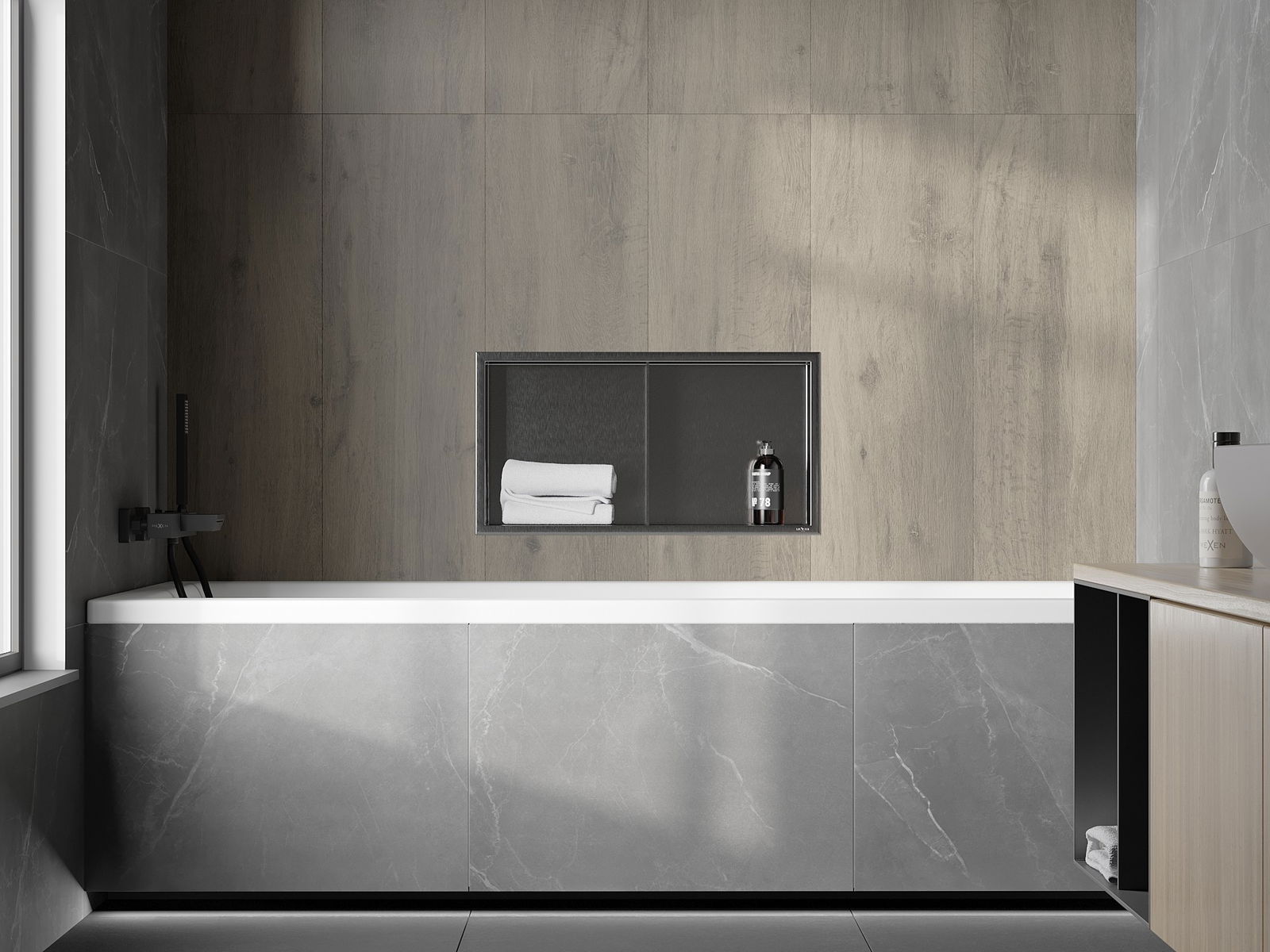Possibilité de montage dans un mur ou dans une construction spécialement préparée. C'est une solution extrêmement moderne et fonctionnelle, permettant d'économiser de l'espace ainsi que d'adapter le produit à l'esthétique de l'intérieur et de créer une composition harmonieuse.