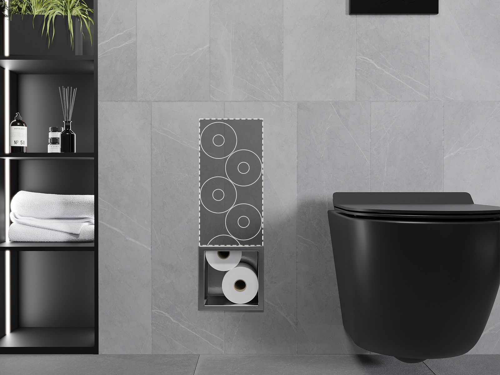 X-wall est un support papier toilette pratique avec un magasin intégré dans le mur. Un nouveau rouleau est toujours à portée de main, et l'espace auparavant dédié au stockage du papier toilette peut être utilisé autrement.