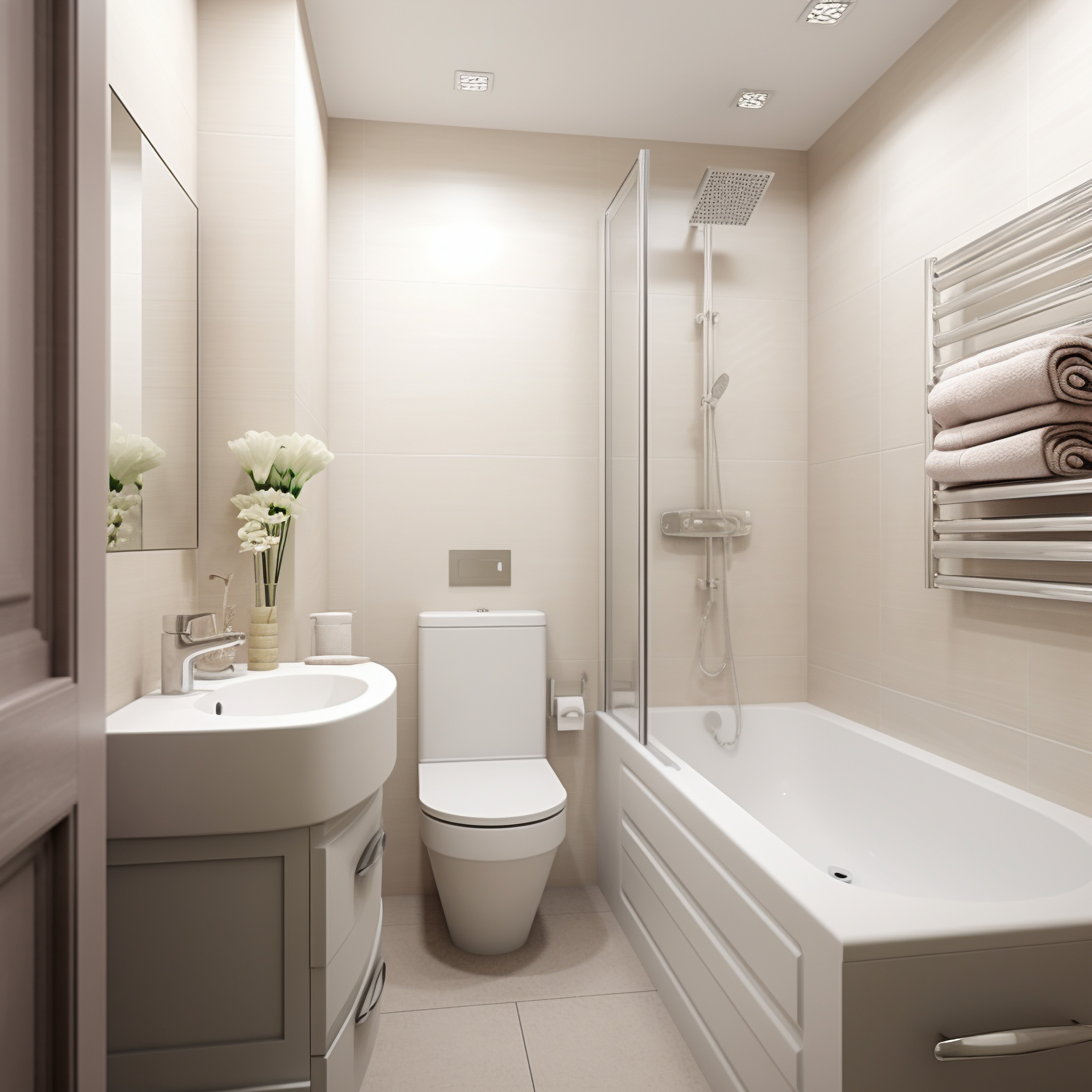 Bonnes résultats obtenus également en utilisant de petits carreaux en deux tons différents – des tons plus clairs sur les murs et plus foncés au sol. Se souvenir de n'utiliser que des teintes froides. Un petit intérieur aménagé de cette manière semble plus spacieux. Par conséquent, n'ayez pas peur des couleurs telles que le blanc, le beige ou encore le bleu clair. En revanche, en cas de plafond bas, posez les carreaux (petits et grands) verticalement. Ainsi, vous allongerez l'intérieur de manière apparente. Assurez-vous de vérifier comment calculer la quantité de carreaux pour un mur pour éviter les achats inutiles.