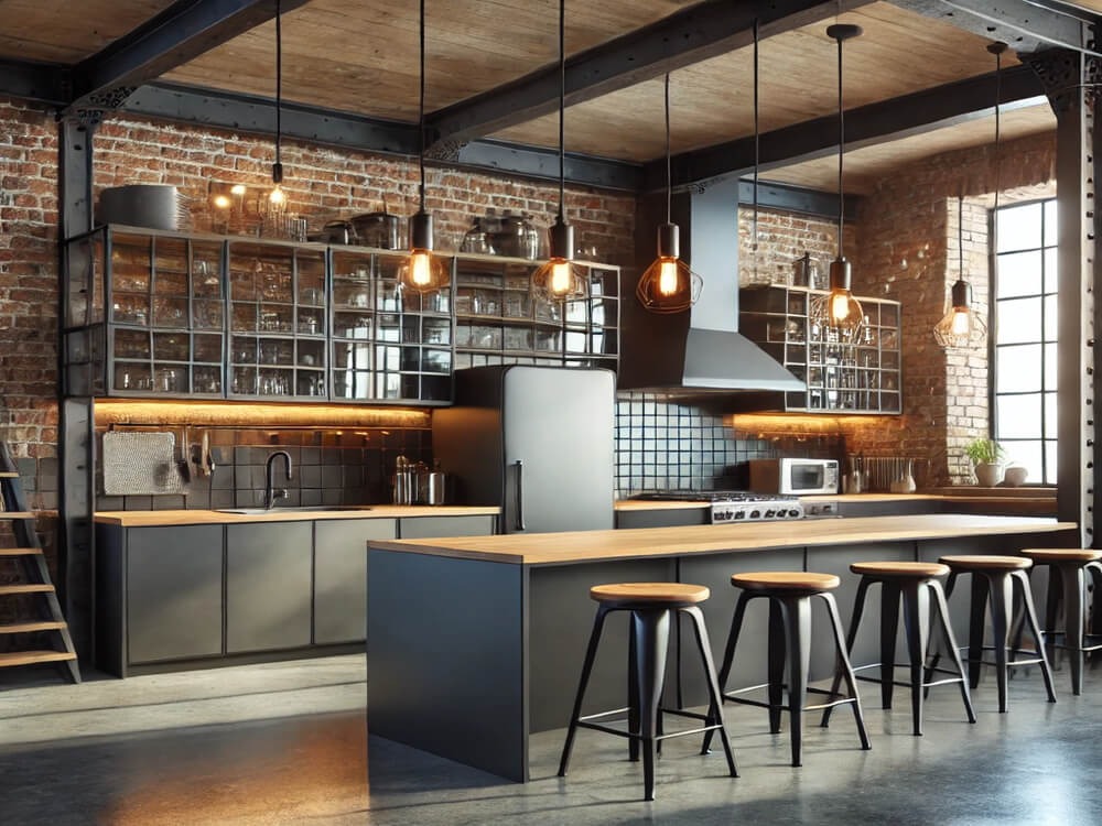 - Quels éléments de décoration créent l'ambiance loft caractéristique dans la cuisine.