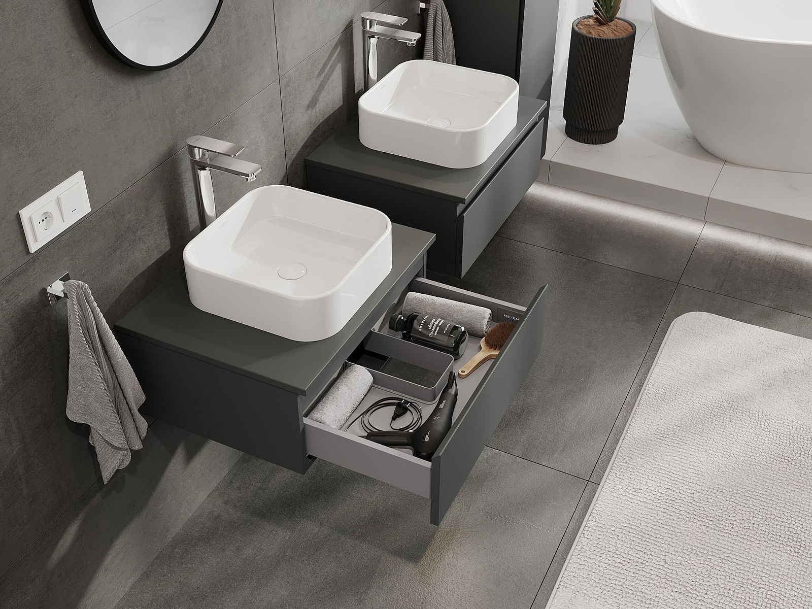 Unsere modularen Badezimmermöbel können in verschiedenen Farbkonfigurationen miteinander kombiniert werden, wodurch eine vollständige Personalisierung ermöglicht wird. Man kann sowohl das Aussehen als auch die Funktionen der einzelnen Elemente auswählen, was es erlaubt, die Möbel an eigene stilistische und funktionale Vorlieben anzupassen.