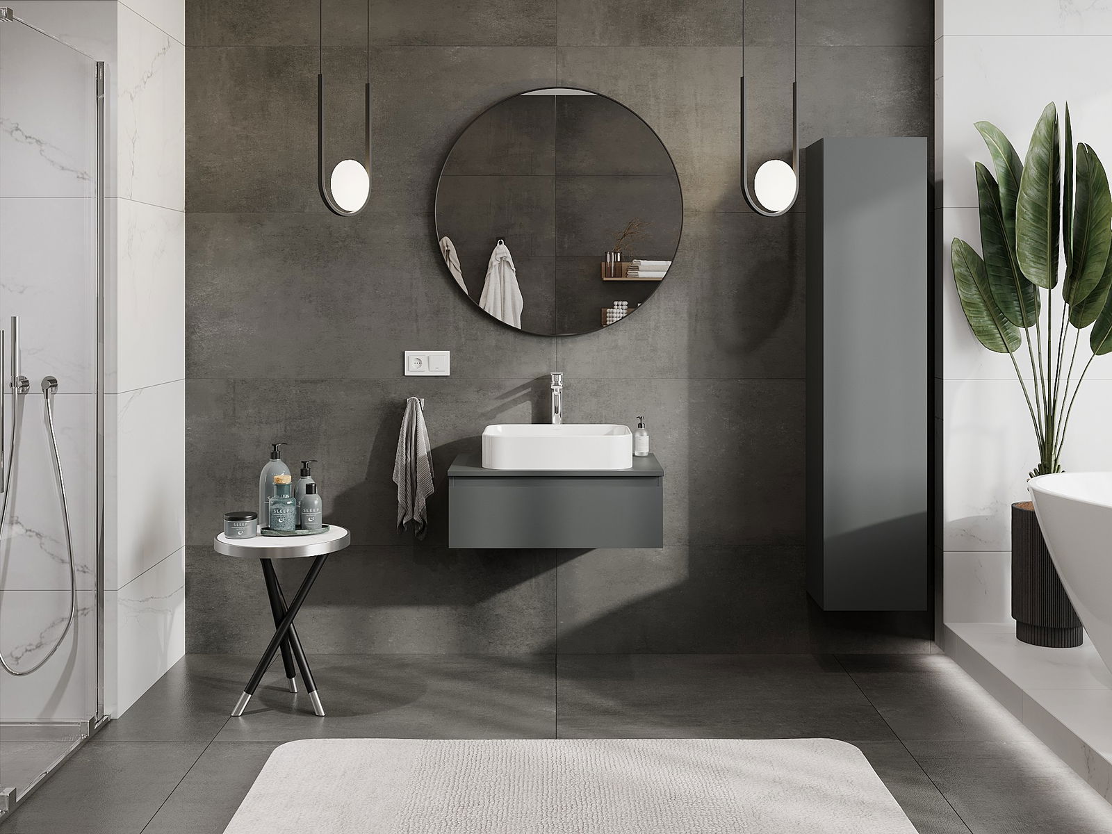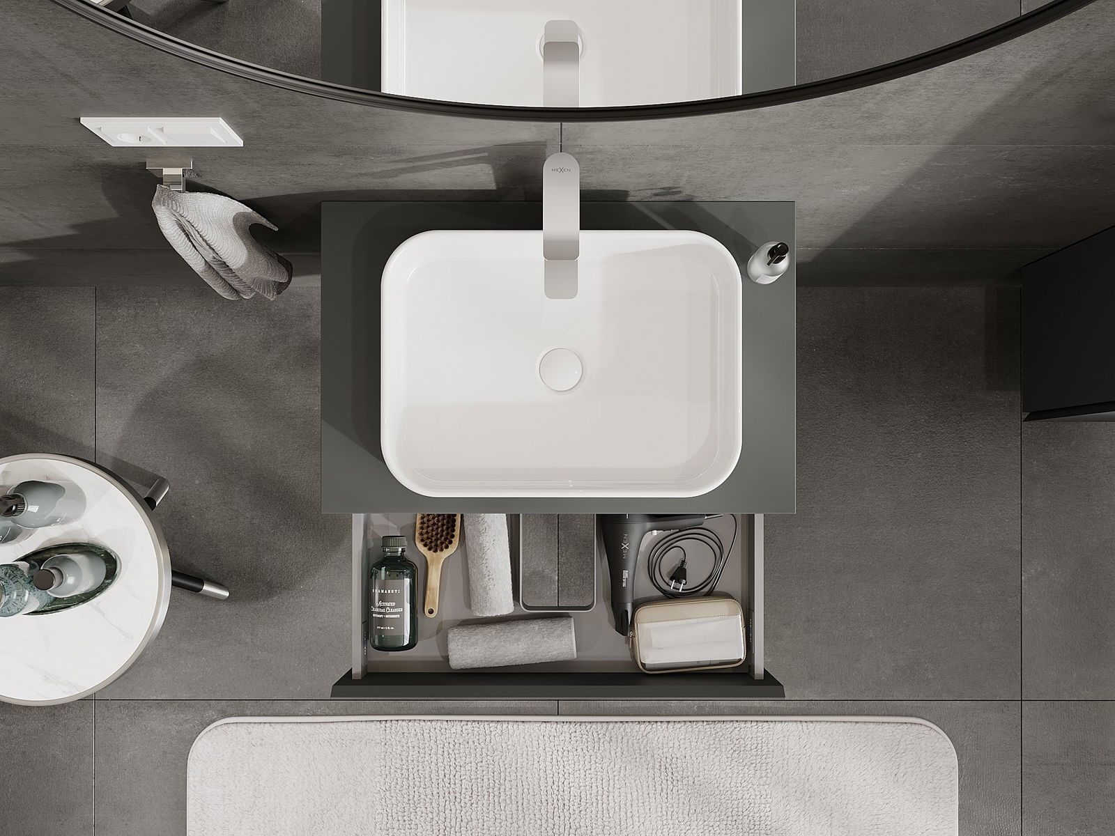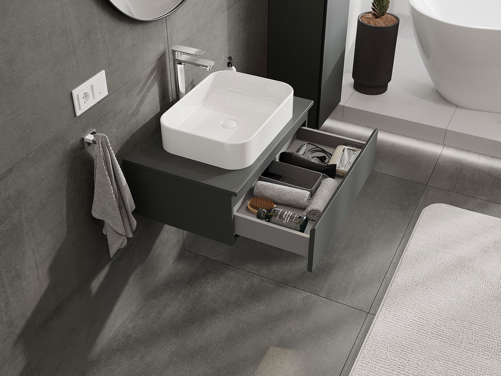 Unsere modularen Badezimmermöbel können in verschiedenen Farbkonfigurationen miteinander kombiniert werden, wodurch eine vollständige Personalisierung ermöglicht wird. Man kann sowohl das Aussehen als auch die Funktionen der einzelnen Elemente auswählen, was es erlaubt, die Möbel an eigene stilistische und funktionale Vorlieben anzupassen.
