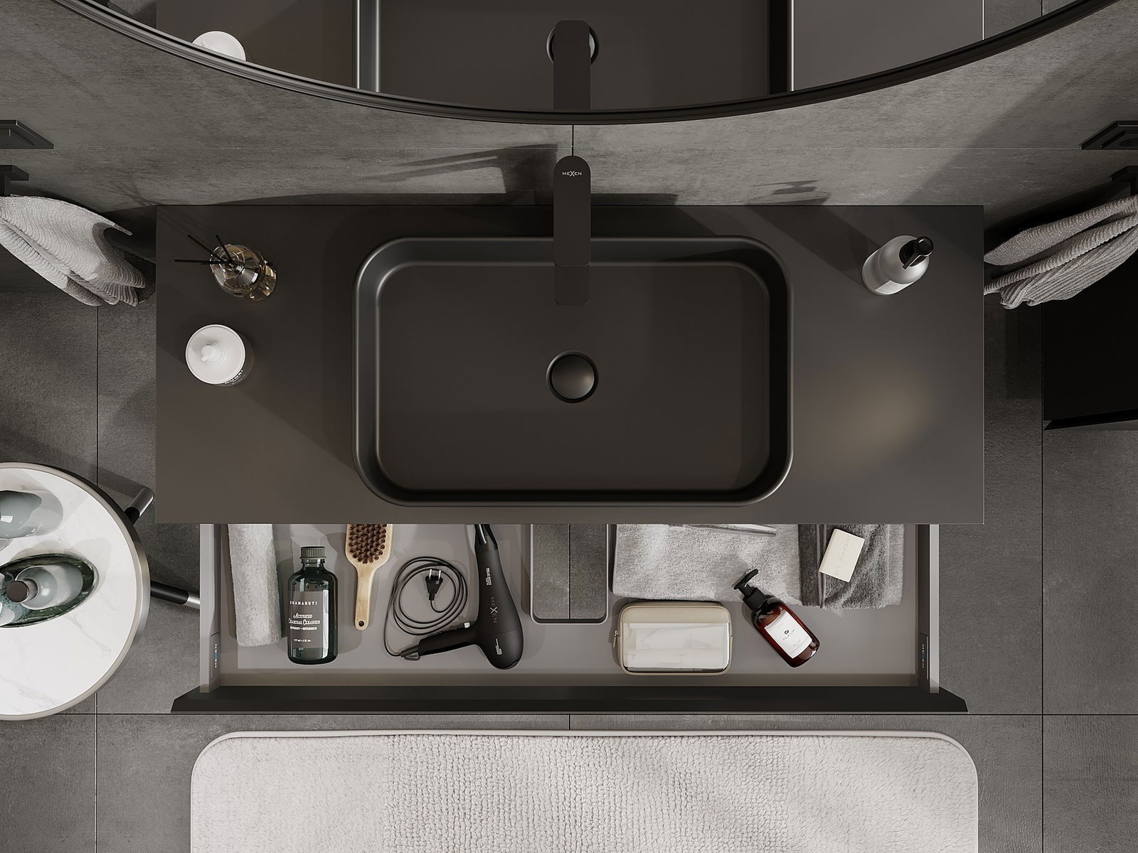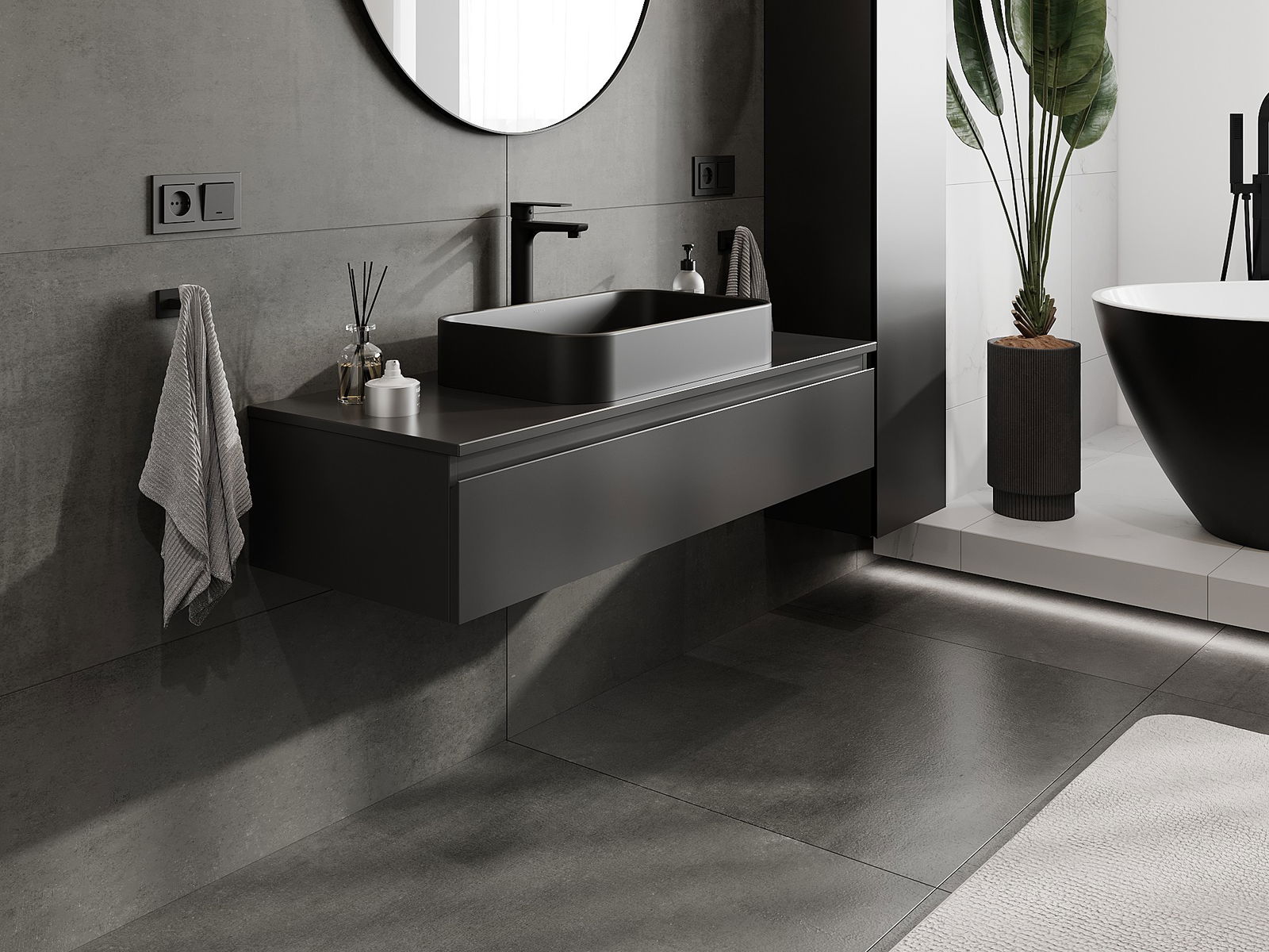 Unsere modularen Badezimmermöbel können in verschiedenen Farbkonfigurationen miteinander kombiniert werden, wodurch eine vollständige Personalisierung ermöglicht wird. Man kann sowohl das Aussehen als auch die Funktionen der einzelnen Elemente auswählen, was es erlaubt, die Möbel an eigene stilistische und funktionale Vorlieben anzupassen.