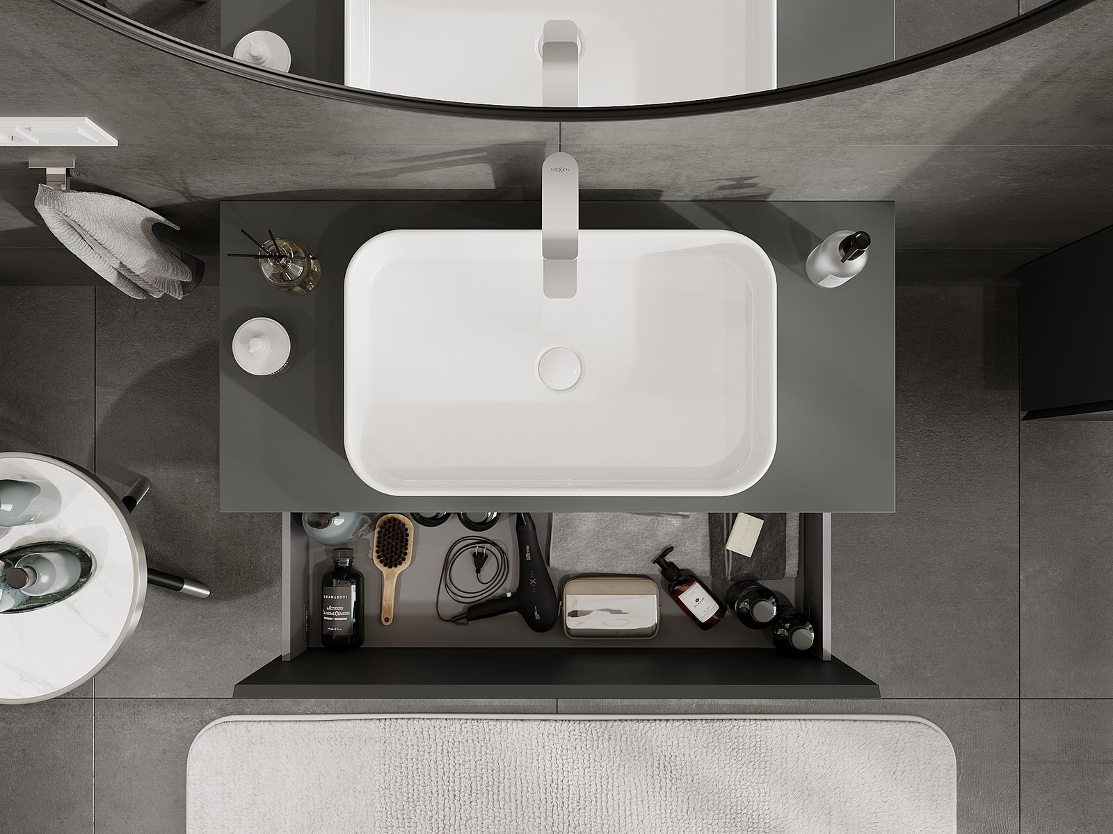 Der Ausschnitt in der Schublade ist so gestaltet, dass er den Siphon aufnehmen kann, der für Waschbeckeninstallationen erforderlich ist. Dadurch kann das Möbelstück voll funktionsfähig montiert werden, ohne auf den Platz in der Schublade zugunsten der Installation verzichten zu müssen.