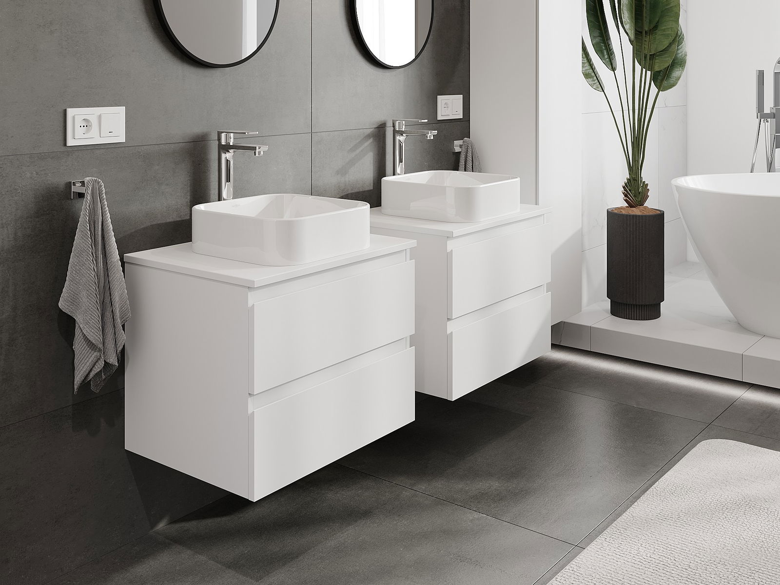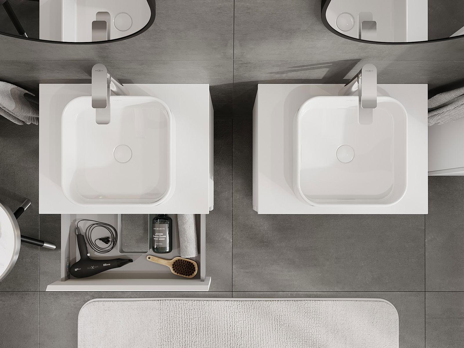 Unsere modularen Badezimmermöbel können in verschiedenen Farbkonfigurationen miteinander kombiniert werden, wodurch eine vollständige Personalisierung ermöglicht wird. Man kann sowohl das Aussehen als auch die Funktionen der einzelnen Elemente auswählen, was es erlaubt, die Möbel an eigene stilistische und funktionale Vorlieben anzupassen.