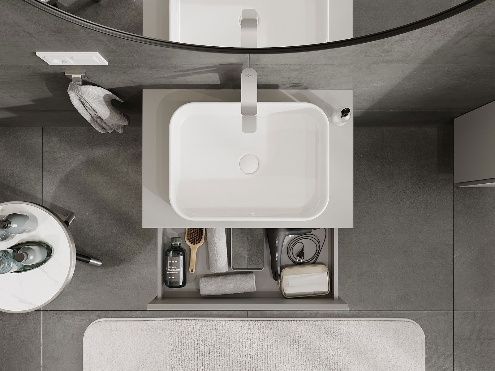 Der Ausschnitt in der Schublade ist so gestaltet, dass er den Siphon aufnehmen kann, der für Waschbeckeninstallationen erforderlich ist. Dadurch kann das Möbelstück voll funktionsfähig montiert werden, ohne auf den Platz in der Schublade zugunsten der Installation verzichten zu müssen.
