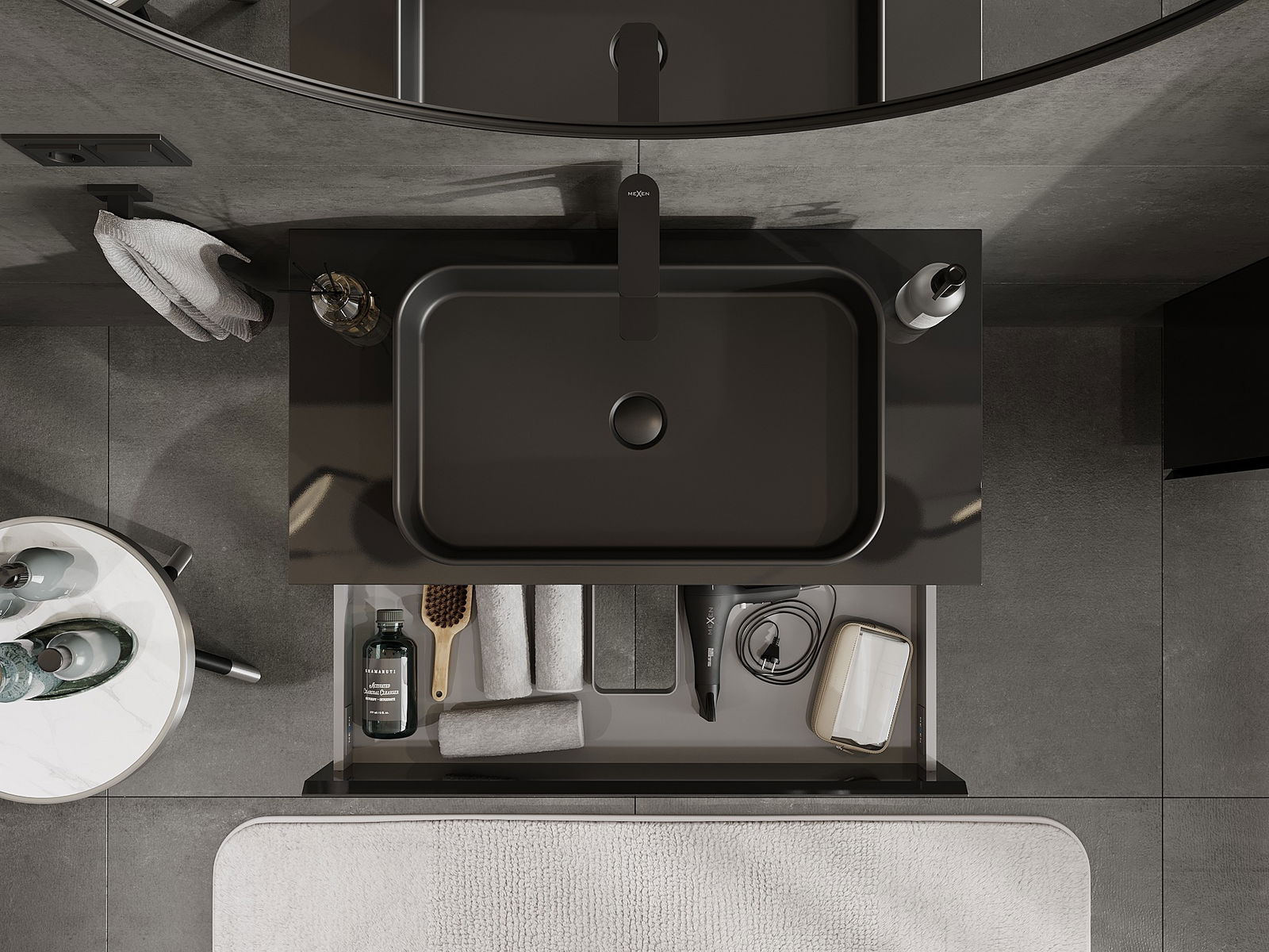 Der Ausschnitt in der Schublade ist so gestaltet, dass er den Siphon aufnehmen kann, der für Waschbeckeninstallationen erforderlich ist. Dadurch kann das Möbelstück voll funktionsfähig montiert werden, ohne auf den Platz in der Schublade zugunsten der Installation verzichten zu müssen.