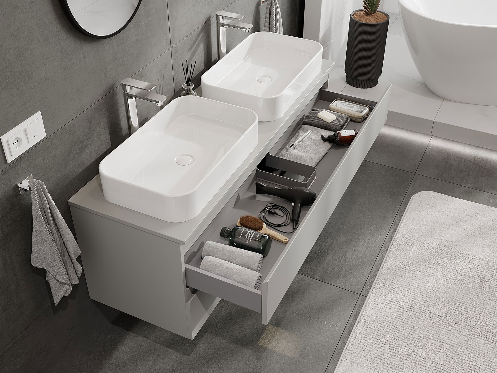 Unsere modularen Badezimmermöbel können in verschiedenen Farbkonfigurationen miteinander kombiniert werden, wodurch eine vollständige Personalisierung ermöglicht wird. Man kann sowohl das Aussehen als auch die Funktionen der einzelnen Elemente auswählen, was es erlaubt, die Möbel an eigene stilistische und funktionale Vorlieben anzupassen.