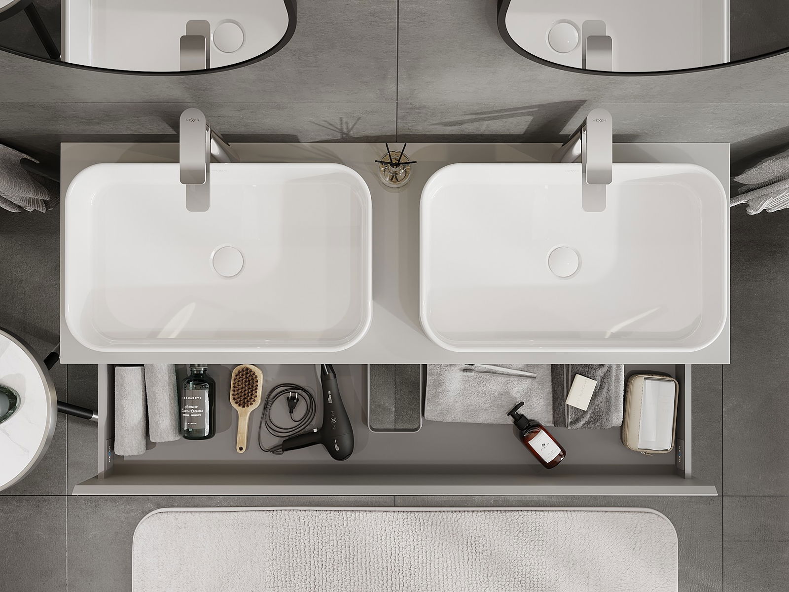 Der Ausschnitt in der Schublade ist so gestaltet, dass er den Siphon aufnehmen kann, der für Waschbeckeninstallationen erforderlich ist. Dadurch kann das Möbelstück voll funktionsfähig montiert werden, ohne auf den Platz in der Schublade zugunsten der Installation verzichten zu müssen.