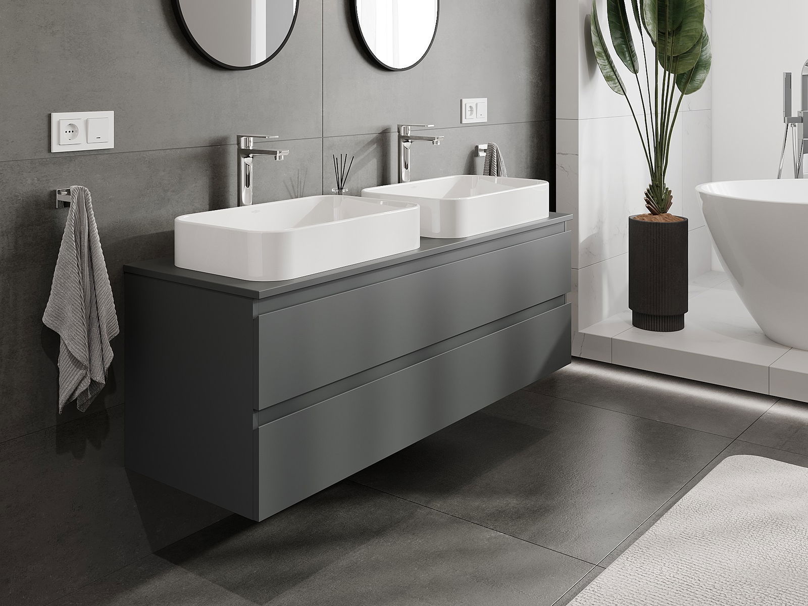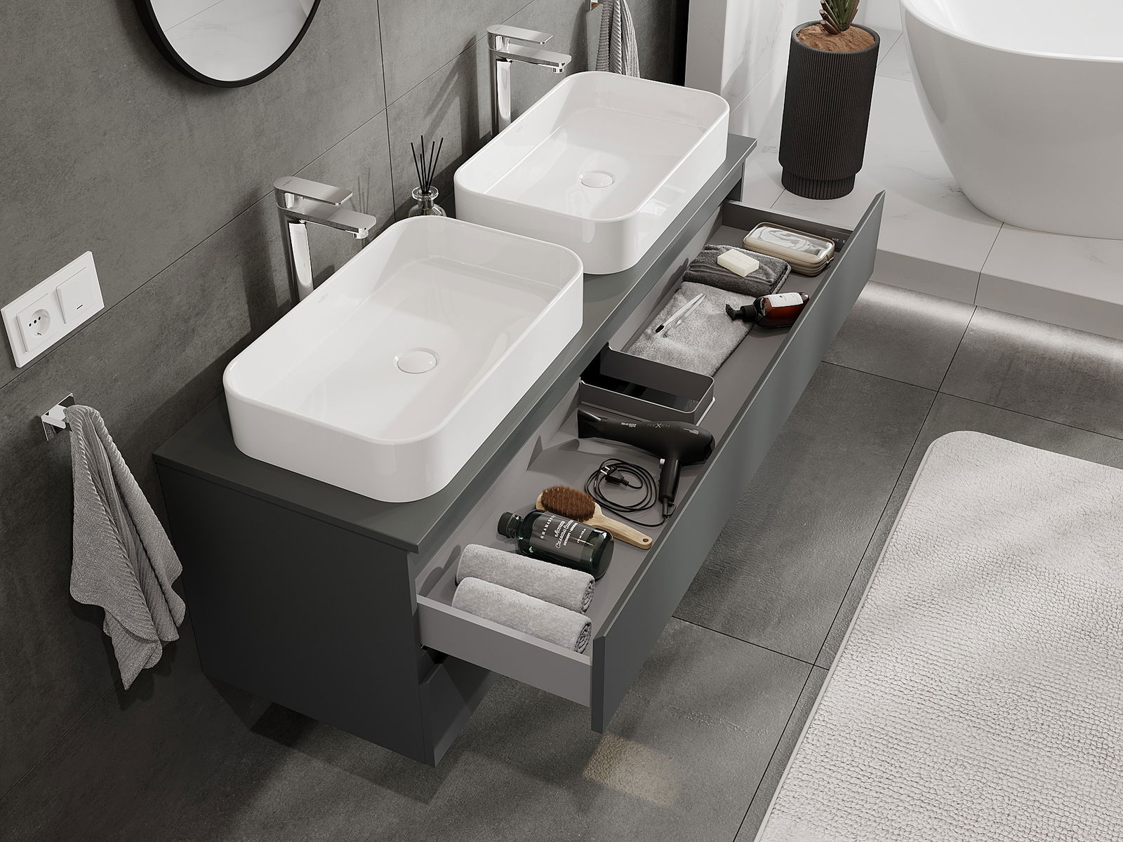 Unsere modularen Badezimmermöbel können in verschiedenen Farbkonfigurationen miteinander kombiniert werden, wodurch eine vollständige Personalisierung ermöglicht wird. Man kann sowohl das Aussehen als auch die Funktionen der einzelnen Elemente auswählen, was es erlaubt, die Möbel an eigene stilistische und funktionale Vorlieben anzupassen.