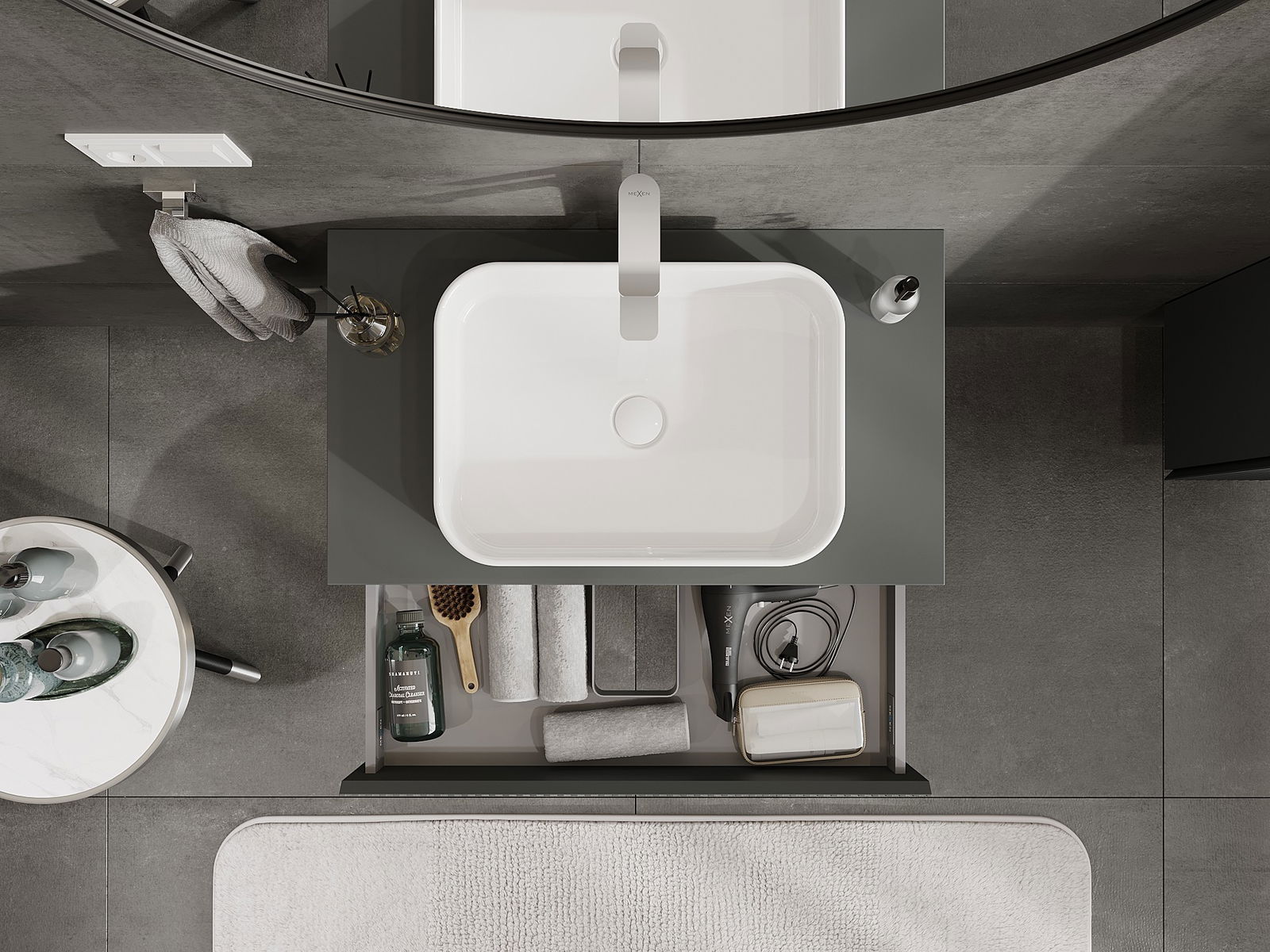 Unsere modularen Badezimmermöbel können in verschiedenen Farbkonfigurationen miteinander kombiniert werden, wodurch eine vollständige Personalisierung ermöglicht wird. Man kann sowohl das Aussehen als auch die Funktionen der einzelnen Elemente auswählen, was es erlaubt, die Möbel an eigene stilistische und funktionale Vorlieben anzupassen.