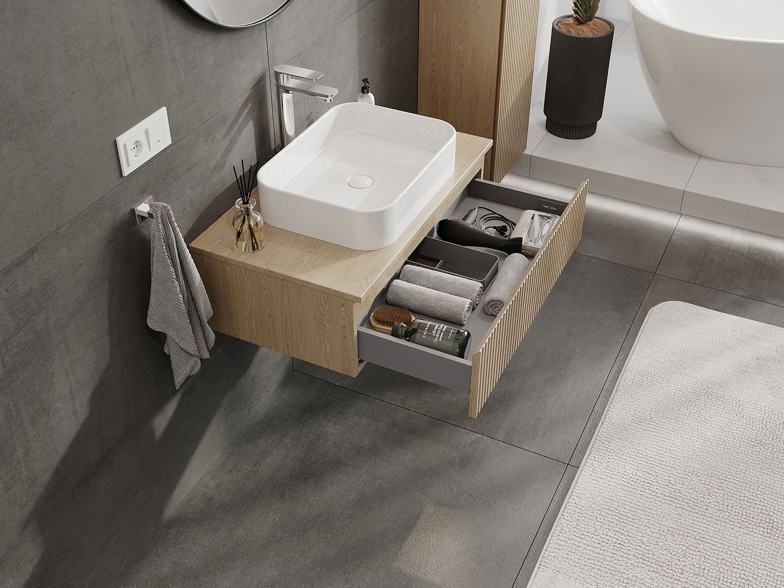 Mexen Rivel Badezimmerunterschrank 80 cm mit Arbeitsplatte, 1 Schublade, geriffelt, Eiche - 91A20-08023-1-BFC81