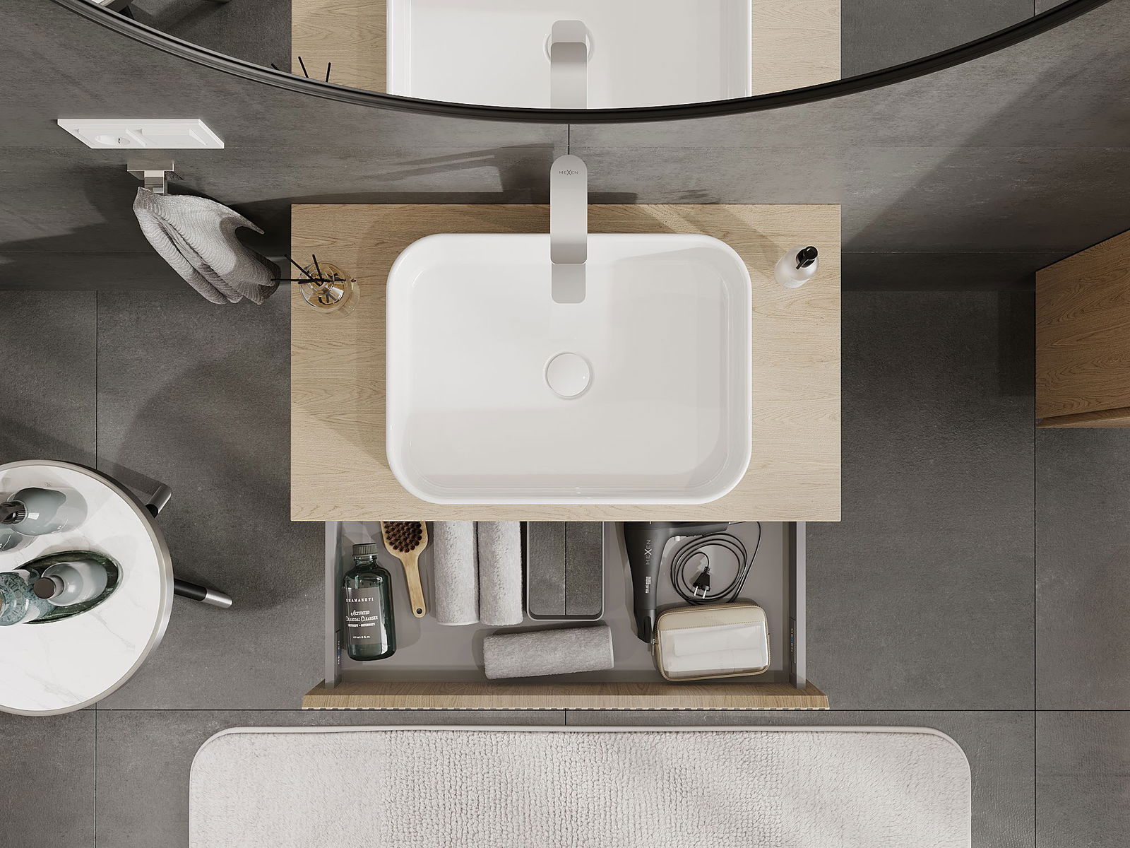 Der Ausschnitt in der Schublade ist so gestaltet, dass er den Siphon aufnehmen kann, der für Waschbeckeninstallationen erforderlich ist. Dadurch kann das Möbelstück voll funktionsfähig montiert werden, ohne auf den Platz in der Schublade zugunsten der Installation verzichten zu müssen.