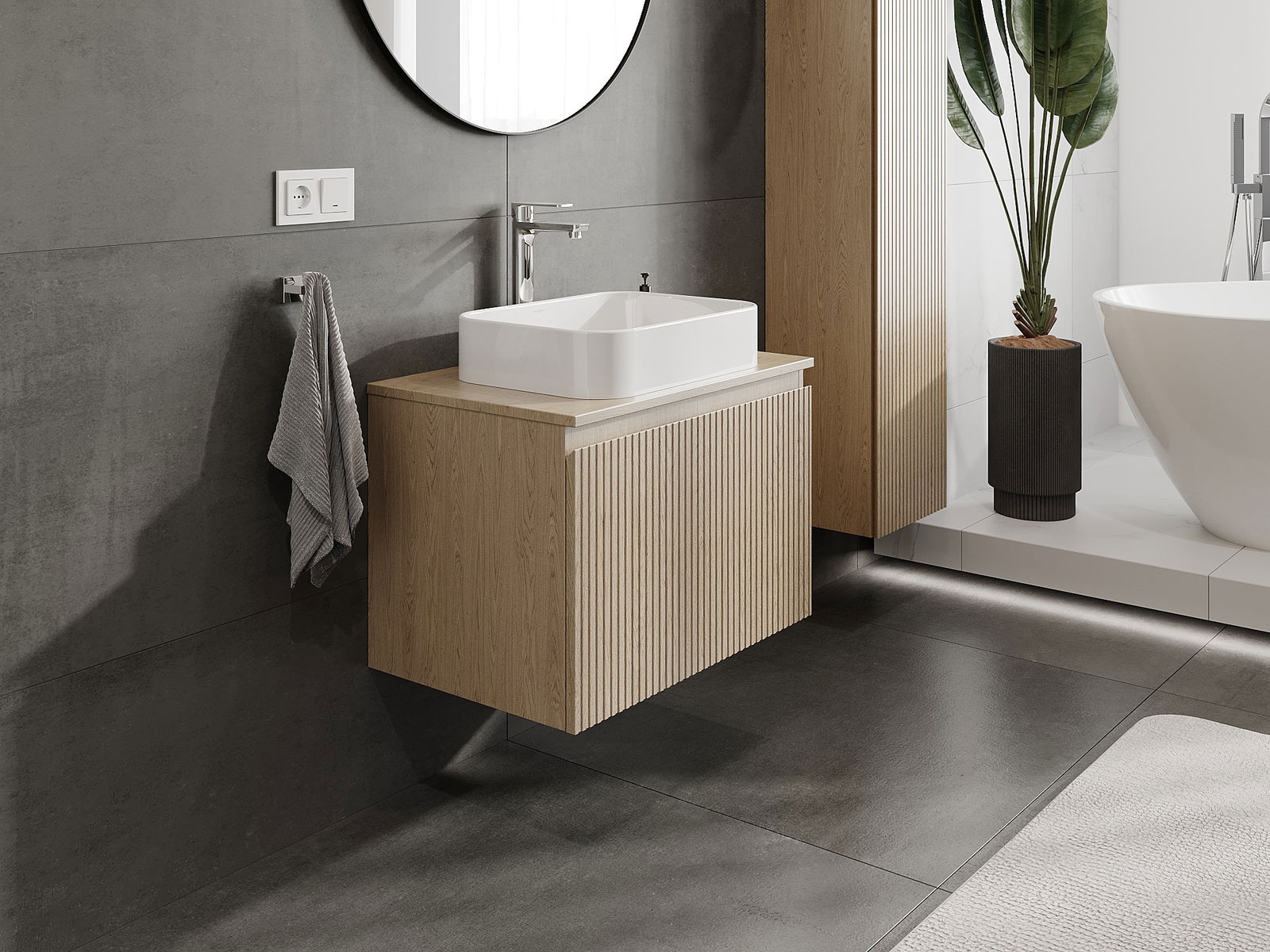 Mexen Rivel Badezimmerschrank unter Waschbecken 70 cm mit Arbeitsplatte, 1 Schublade, geriffelt, Eiche - 91A20-07047-1-BFC81