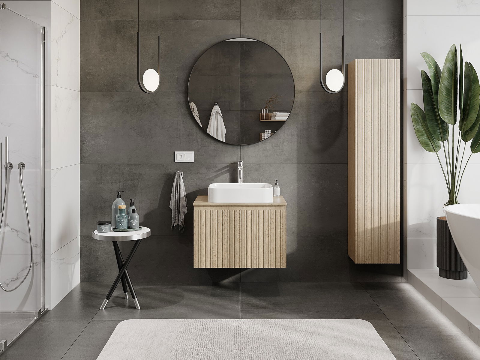 Unsere modularen Badezimmermöbel können in verschiedenen Farbkonfigurationen miteinander kombiniert werden, wodurch eine vollständige Personalisierung ermöglicht wird. Man kann sowohl das Aussehen als auch die Funktionen der einzelnen Elemente auswählen, was es erlaubt, die Möbel an eigene stilistische und funktionale Vorlieben anzupassen.