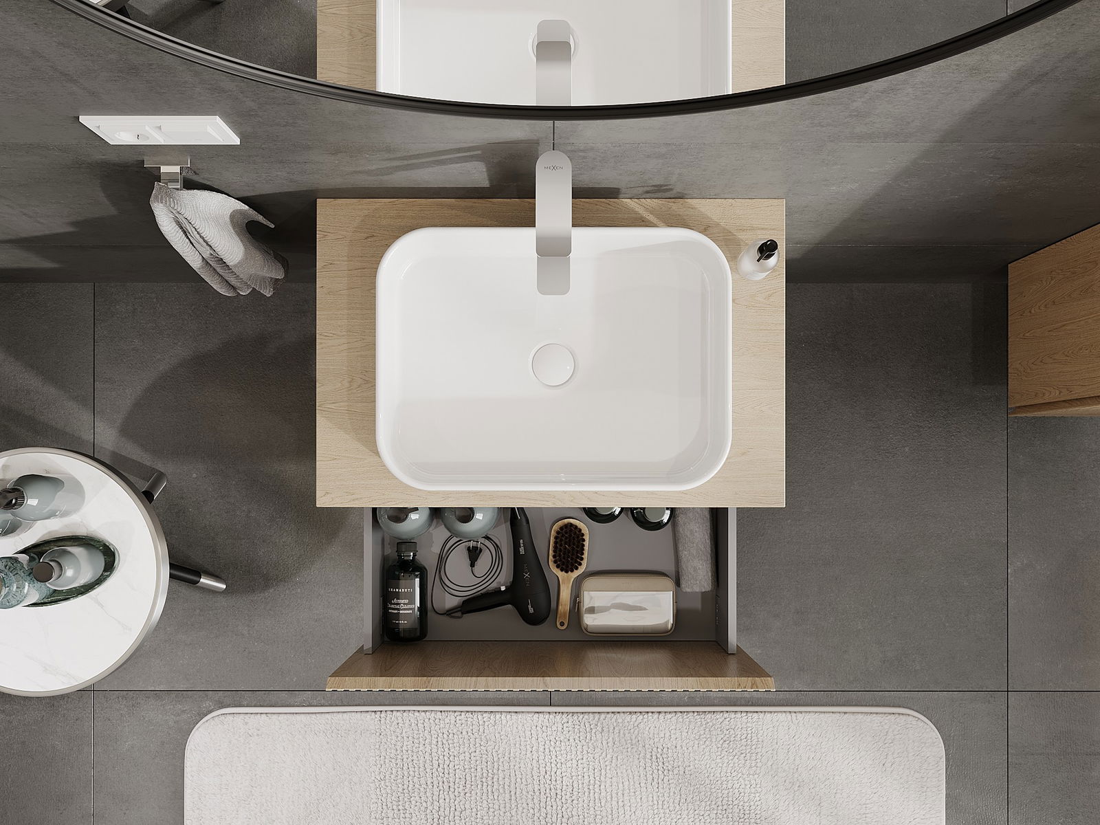 Der Ausschnitt in der Schublade ist so gestaltet, dass er den Siphon aufnehmen kann, der für Waschbeckeninstallationen erforderlich ist. Dadurch kann das Möbelstück voll funktionsfähig montiert werden, ohne auf den Platz in der Schublade zugunsten der Installation verzichten zu müssen.