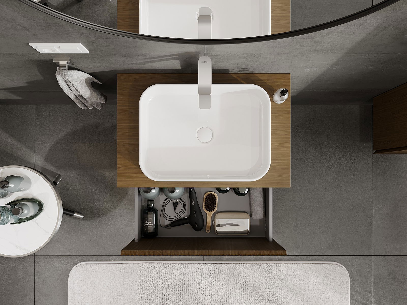Der Ausschnitt in der Schublade ist so gestaltet, dass er den Siphon aufnehmen kann, der für Waschbeckeninstallationen erforderlich ist. Dadurch kann das Möbelstück voll funktionsfähig montiert werden, ohne auf den Platz in der Schublade zugunsten der Installation verzichten zu müssen.