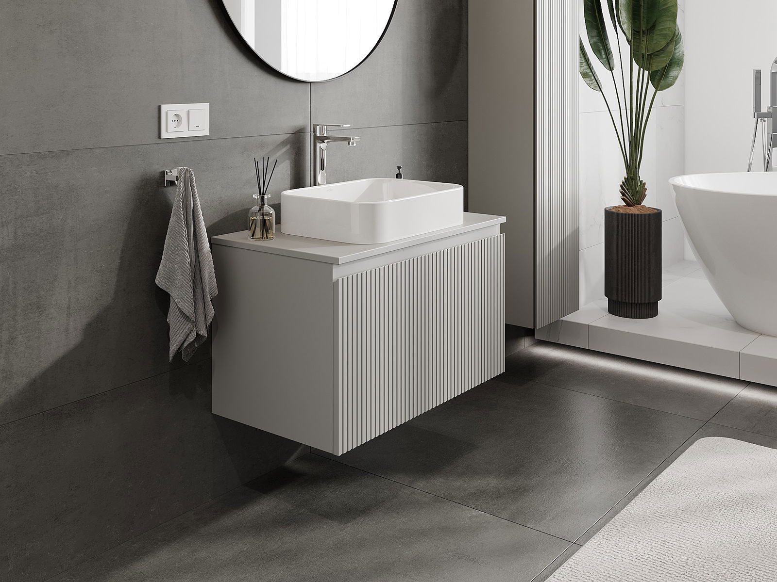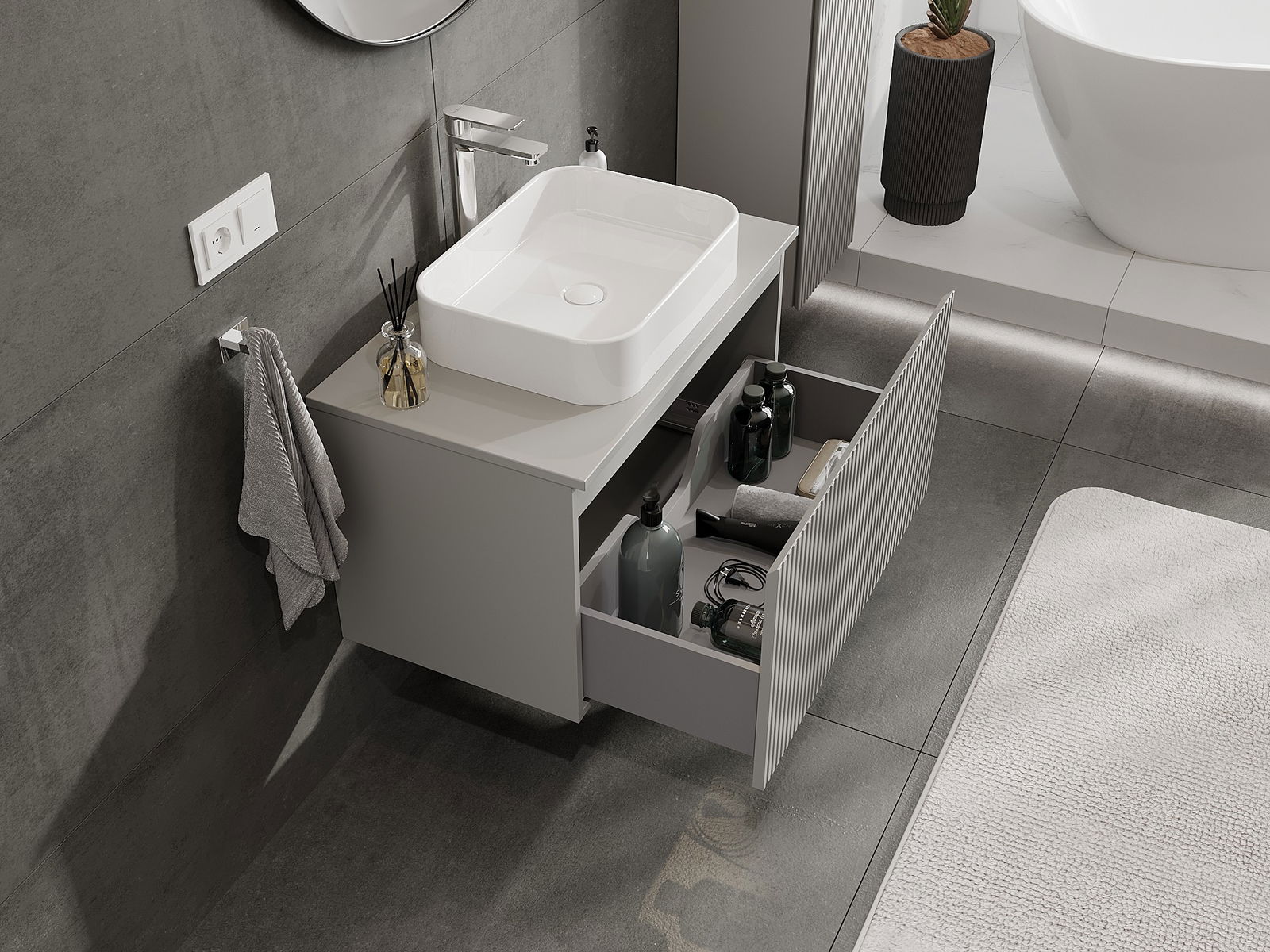 Unsere modularen Badezimmermöbel können in verschiedenen Farbkonfigurationen miteinander kombiniert werden, wodurch eine vollständige Personalisierung ermöglicht wird. Man kann sowohl das Aussehen als auch die Funktionen der einzelnen Elemente auswählen, was es erlaubt, die Möbel an eigene stilistische und funktionale Vorlieben anzupassen.