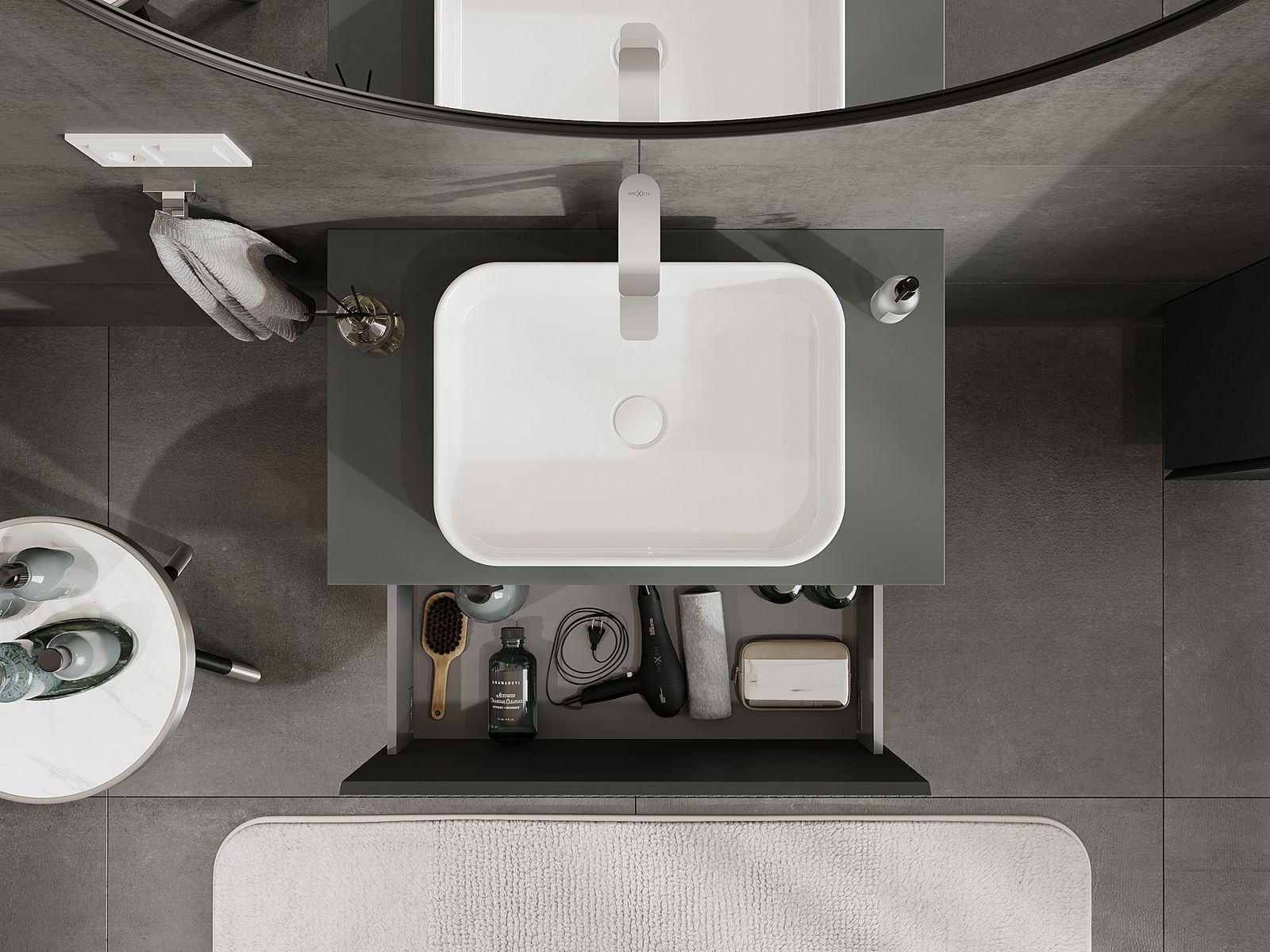 Unsere modularen Badezimmermöbel können in verschiedenen Farbkonfigurationen miteinander kombiniert werden, wodurch eine vollständige Personalisierung ermöglicht wird. Man kann sowohl das Aussehen als auch die Funktionen der einzelnen Elemente auswählen, was es erlaubt, die Möbel an eigene stilistische und funktionale Vorlieben anzupassen.