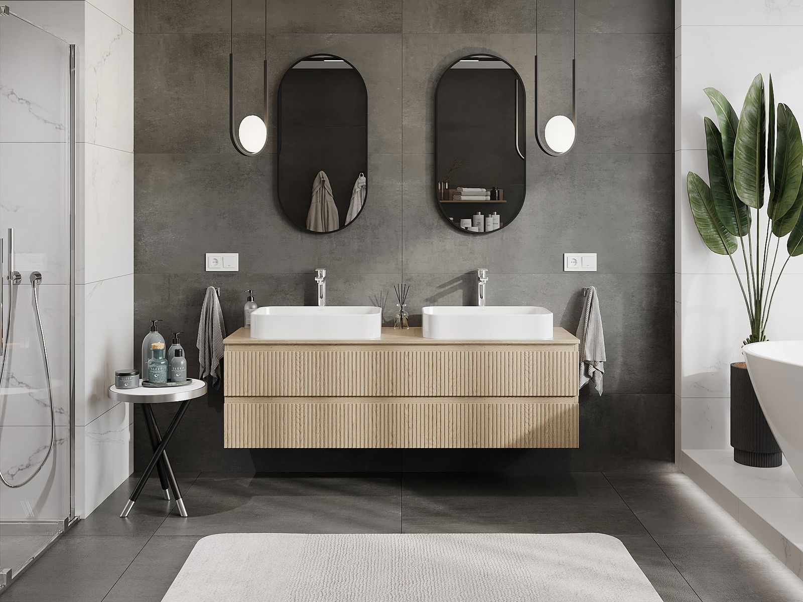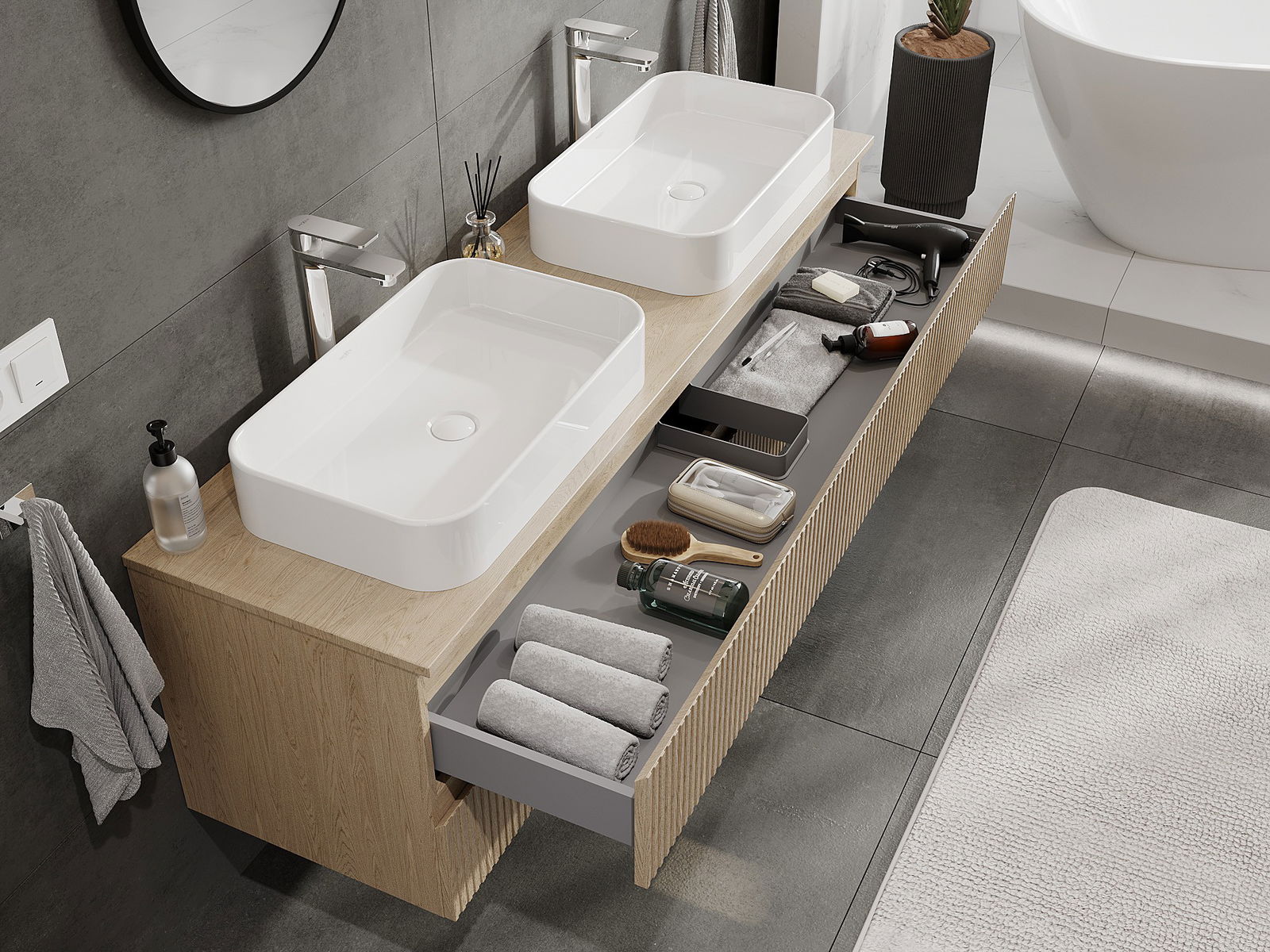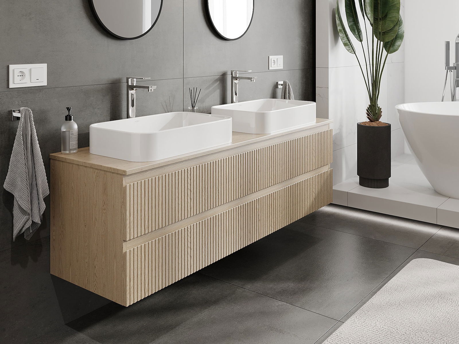 Unsere modularen Badezimmermöbel können in verschiedenen Farbkonfigurationen miteinander kombiniert werden, wodurch eine vollständige Personalisierung ermöglicht wird. Man kann sowohl das Aussehen als auch die Funktionen der einzelnen Elemente auswählen, was es erlaubt, die Möbel an eigene stilistische und funktionale Vorlieben anzupassen.