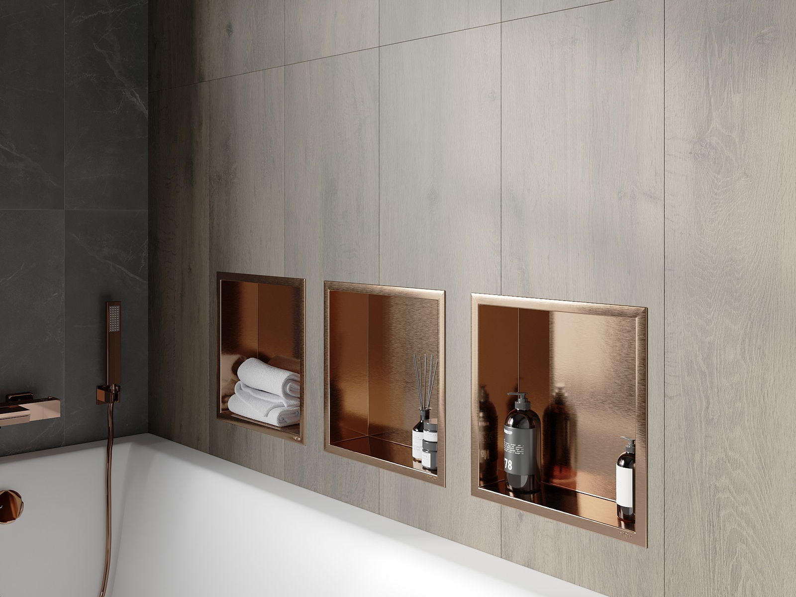 Möglichkeit zur Montage in der Wand oder in einer speziell vorbereiteten Verkleidung. Es ist eine äußerst moderne und funktionale Lösung, die es ermöglicht, Platz zu sparen und das Produkt an die Ästhetik des Raums anzupassen und eine harmonische Komposition zu schaffen.
