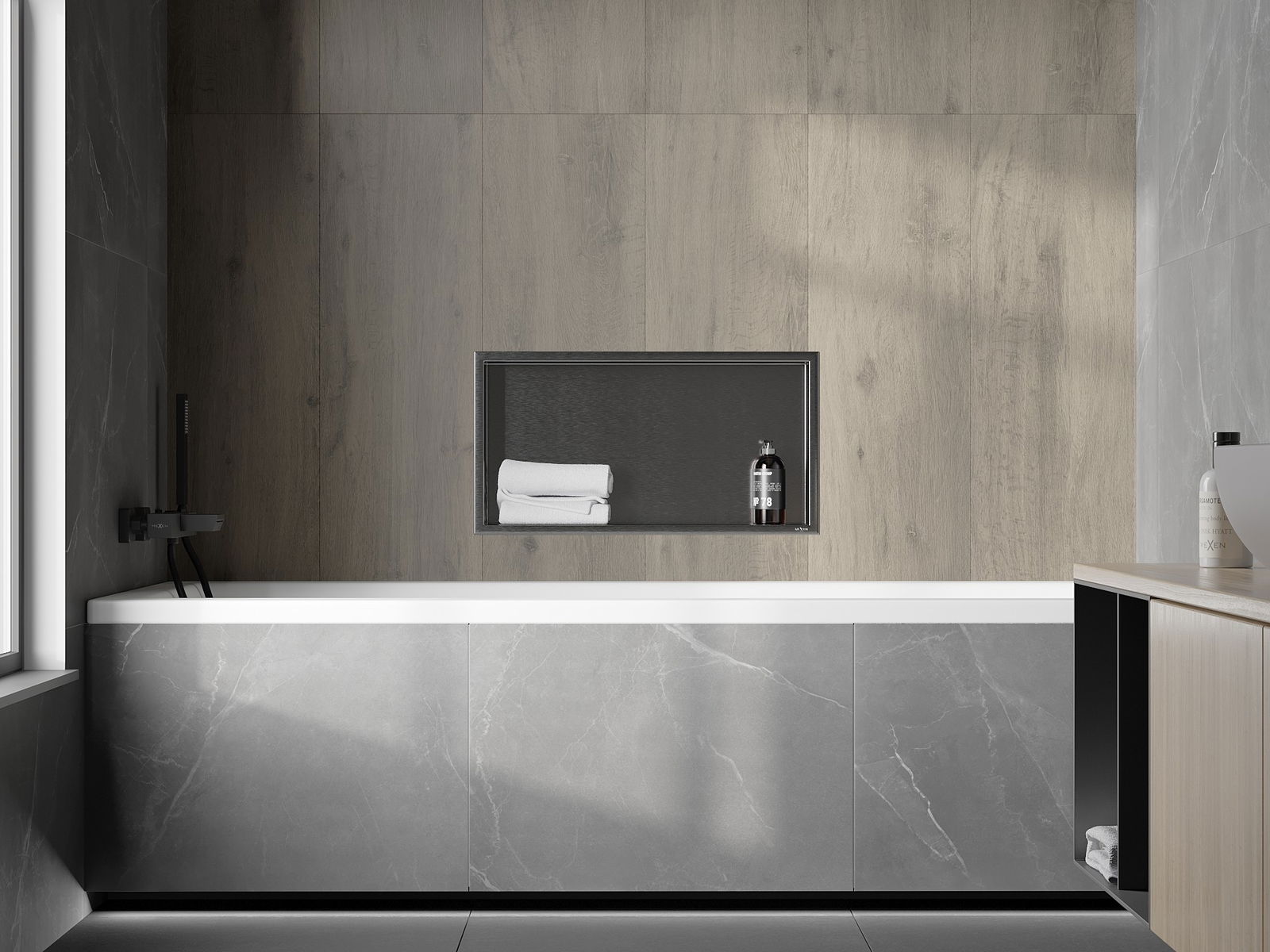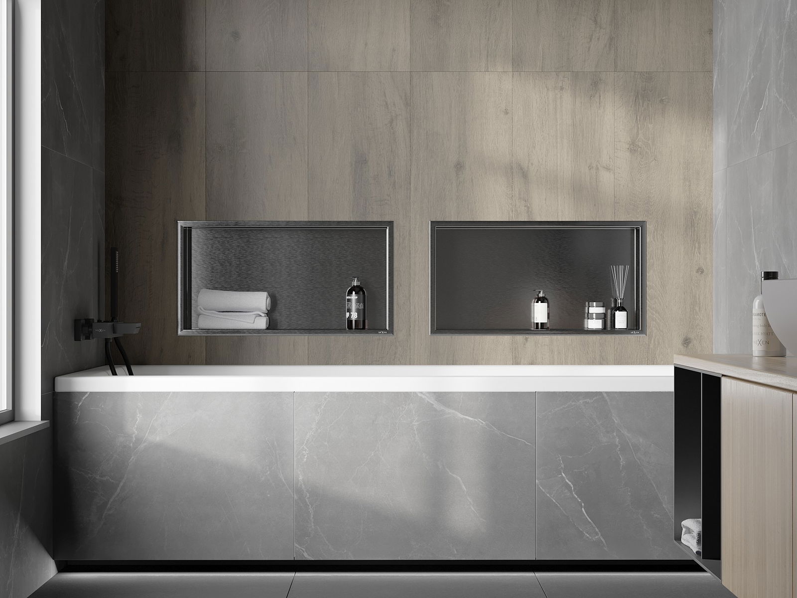 Möglichkeit zur Montage in der Wand oder in einer speziell vorbereiteten Verkleidung. Es ist eine äußerst moderne und funktionale Lösung, die es ermöglicht, Platz zu sparen und das Produkt an die Ästhetik des Raums anzupassen und eine harmonische Komposition zu schaffen.