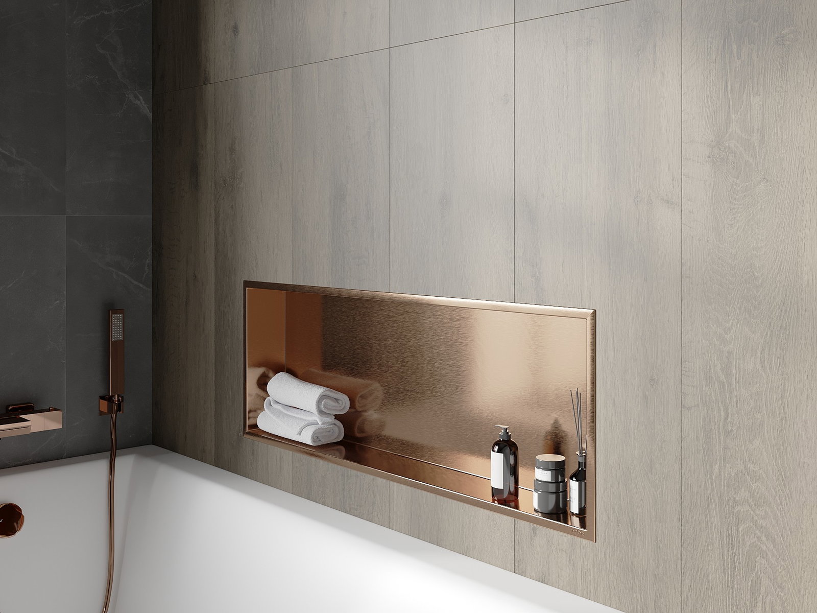 Möglichkeit zur Montage in der Wand oder in einer speziell vorbereiteten Verkleidung. Es ist eine äußerst moderne und funktionale Lösung, die es ermöglicht, Platz zu sparen und das Produkt an die Ästhetik des Raums anzupassen und eine harmonische Komposition zu schaffen.