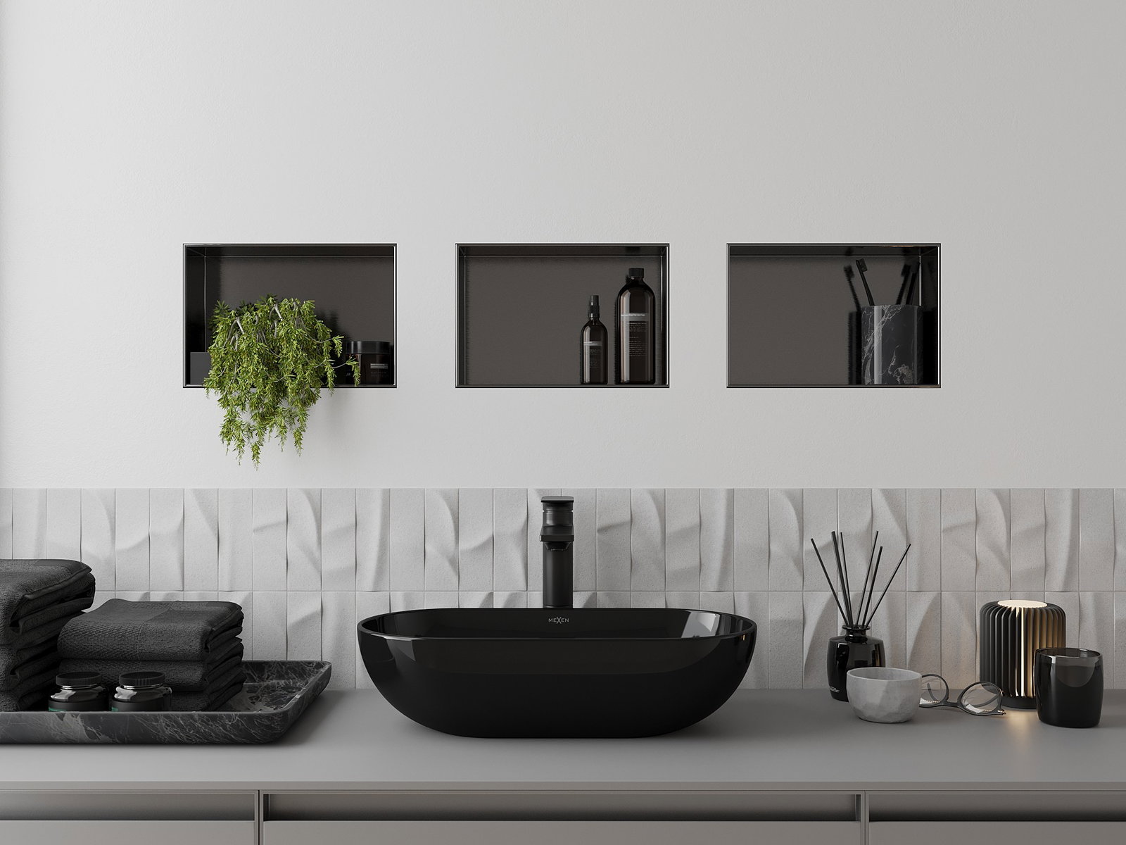 Möglichkeit zur Montage in der Wand oder in einer speziell vorbereiteten Verkleidung. Es ist eine äußerst moderne und funktionale Lösung, die es ermöglicht, Platz zu sparen und das Produkt an die Ästhetik des Raums anzupassen und eine harmonische Komposition zu schaffen.
