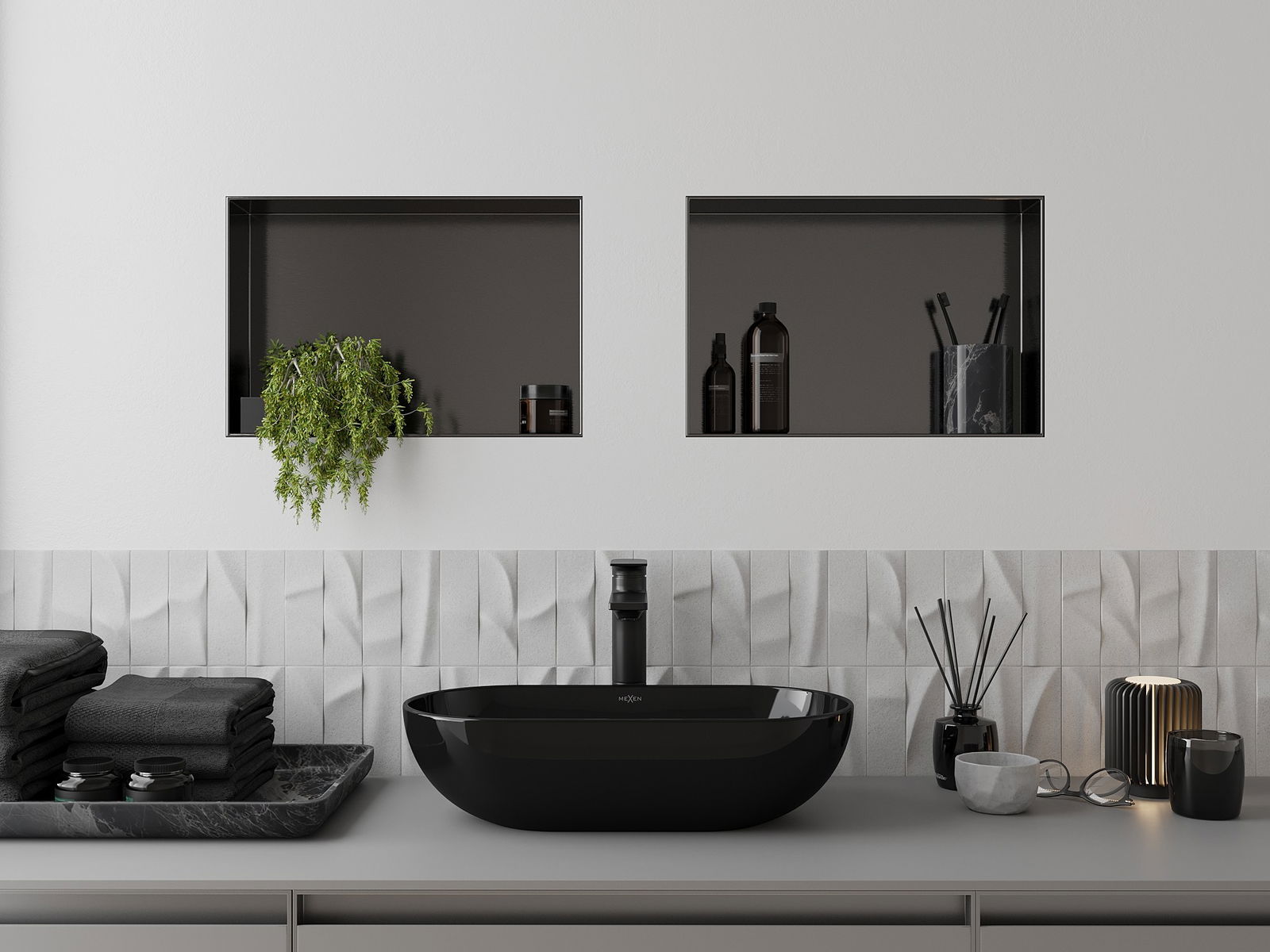 Möglichkeit zur Montage in der Wand oder in einer speziell vorbereiteten Verkleidung. Es ist eine äußerst moderne und funktionale Lösung, die es ermöglicht, Platz zu sparen und das Produkt an die Ästhetik des Raums anzupassen und eine harmonische Komposition zu schaffen.
