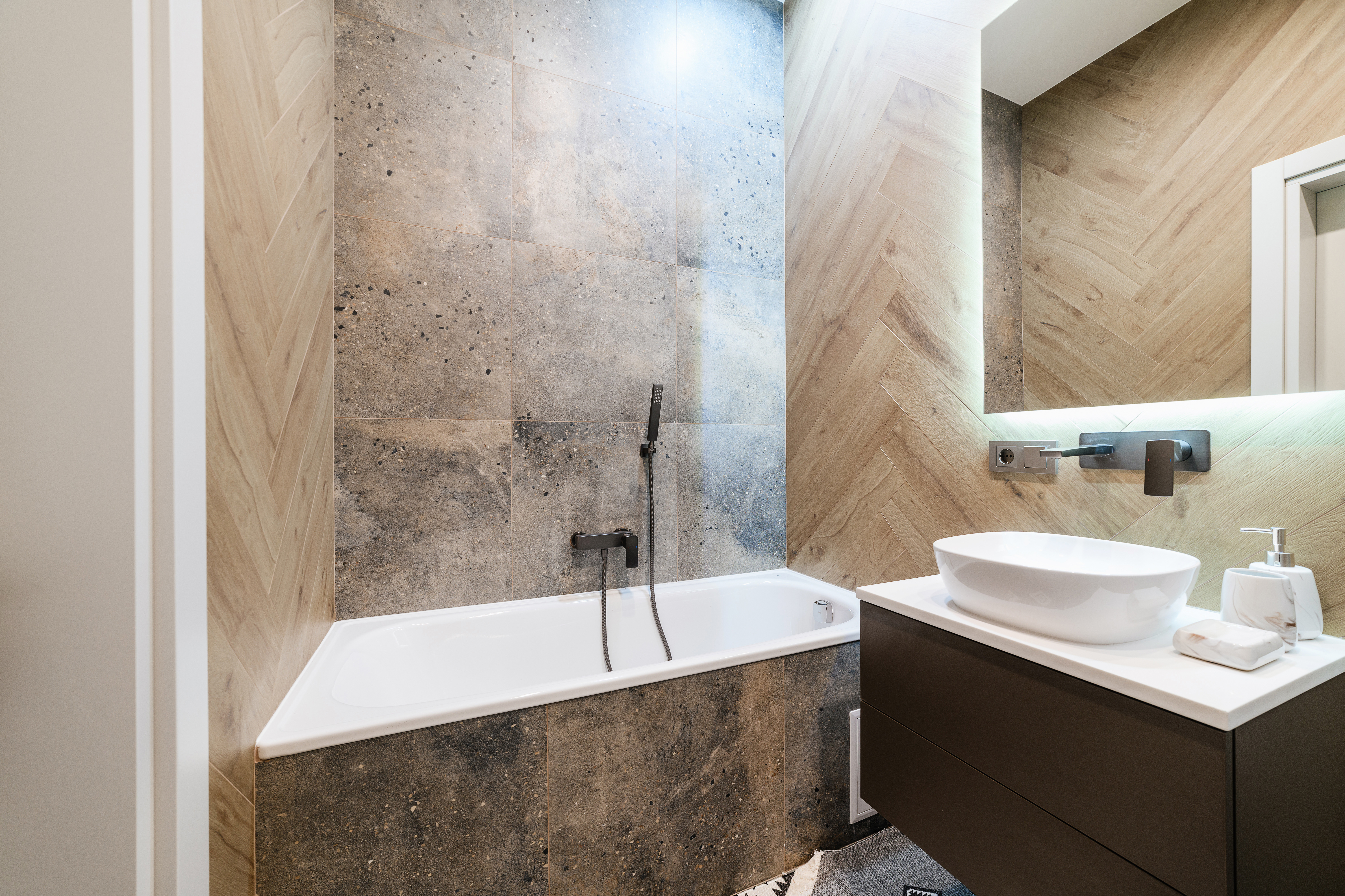 In einem kleinen Badezimmer kann ein oberflächenmontiertes Wannensystem verwendet werden. Es sollte jedoch an einem geeigneten Ort installiert werden. Wenn es klein ist und sehr attraktiv aussieht, kann es dem ganzen Raum Charme verleihen. Ist das Badezimmer in hellen Farben gehalten, was auf kleinem Raum empfohlen wird, kann die Wannenarmatur in einer dunklen Farbe sein. Auf diese Weise kontrastiert sie perfekt mit den hellen Fliesen und der Wanne und schafft eine gewisse Farbtiefe. Ein solcher Kontrast kann auch helfen, den Raum optisch zu vergrößern.