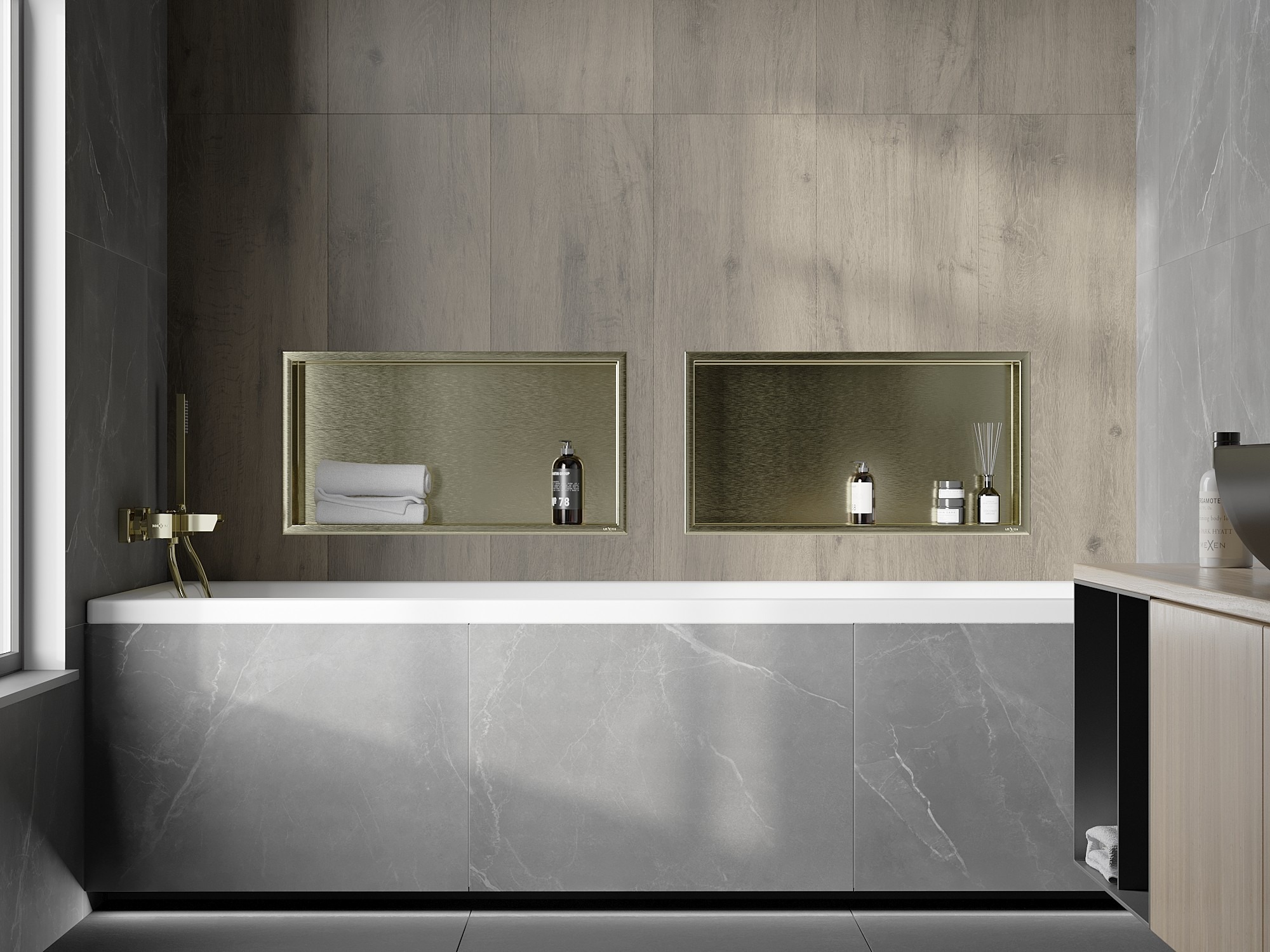 Nischenregale sehen attraktiv aus. Sie passen hervorragend zu vielen Badezimmerdesigns, die im skandinavischen, modernen, industriellen und sogar minimalistischen Stil eingerichtet sind. Anstatt Körbe für Kosmetika zu kaufen, die nicht sehr praktisch sind und wertvollen Platz im Badezimmer beanspruchen, ist es besser, beim Renovieren Regale in die Nische zu integrieren. Du kannst den Raum an deine Bedürfnisse anpassen und durch die Verwendung von Materialien wie glasierten Feinsteinzeug ohne große Probleme seine Sauberkeit sicherstellen. Nischenregale über der Badewanne und unter der Dusche zeichnen sich durch Feuchtigkeitsbeständigkeit aus.