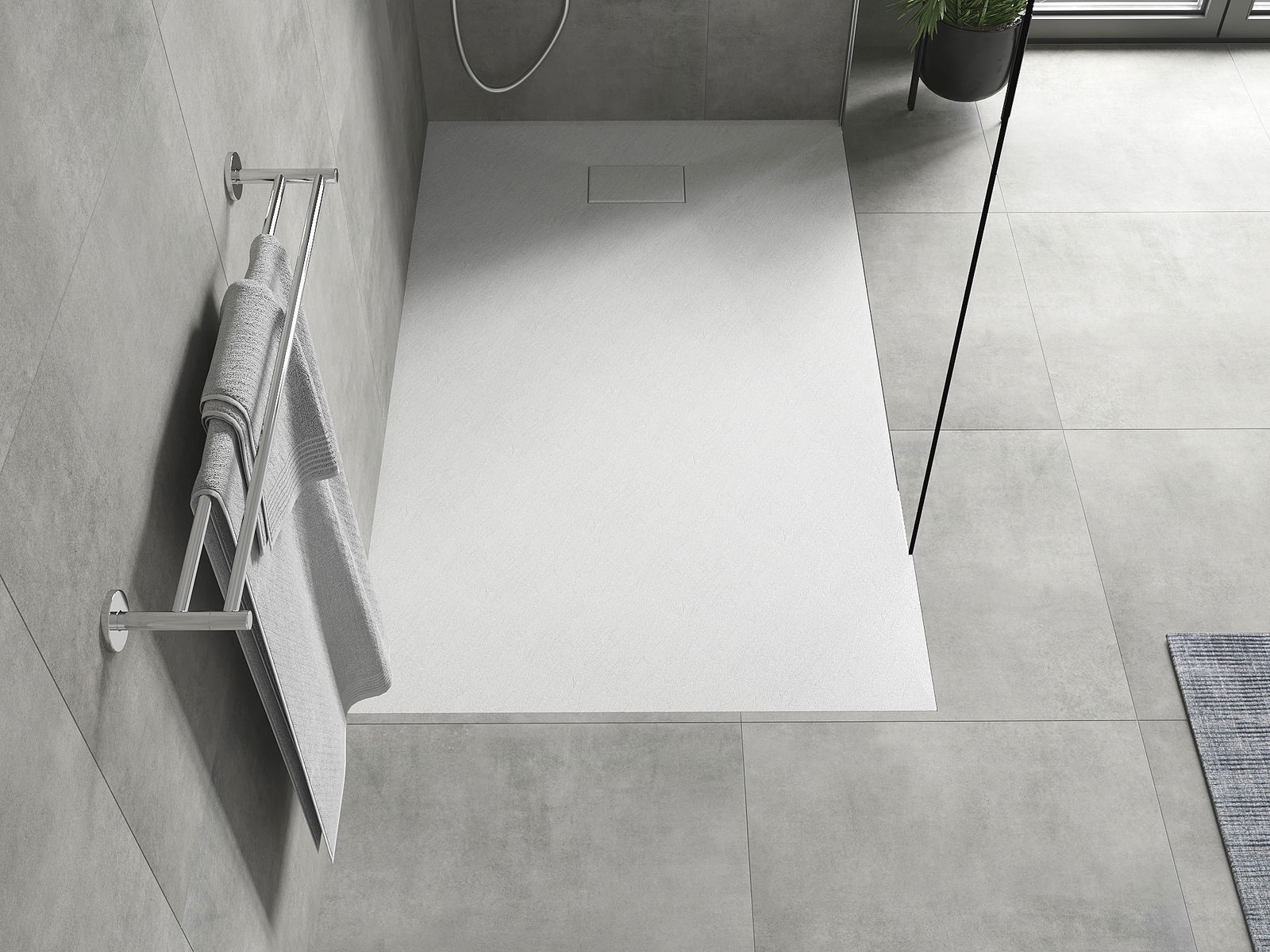 The surface of the shower tray resembles stone in its structure. It is a unique combination of a natural appearance with modern interior design. It adds character, enhances the aesthetics and elegance of the bathroom decor, and delights with its form.