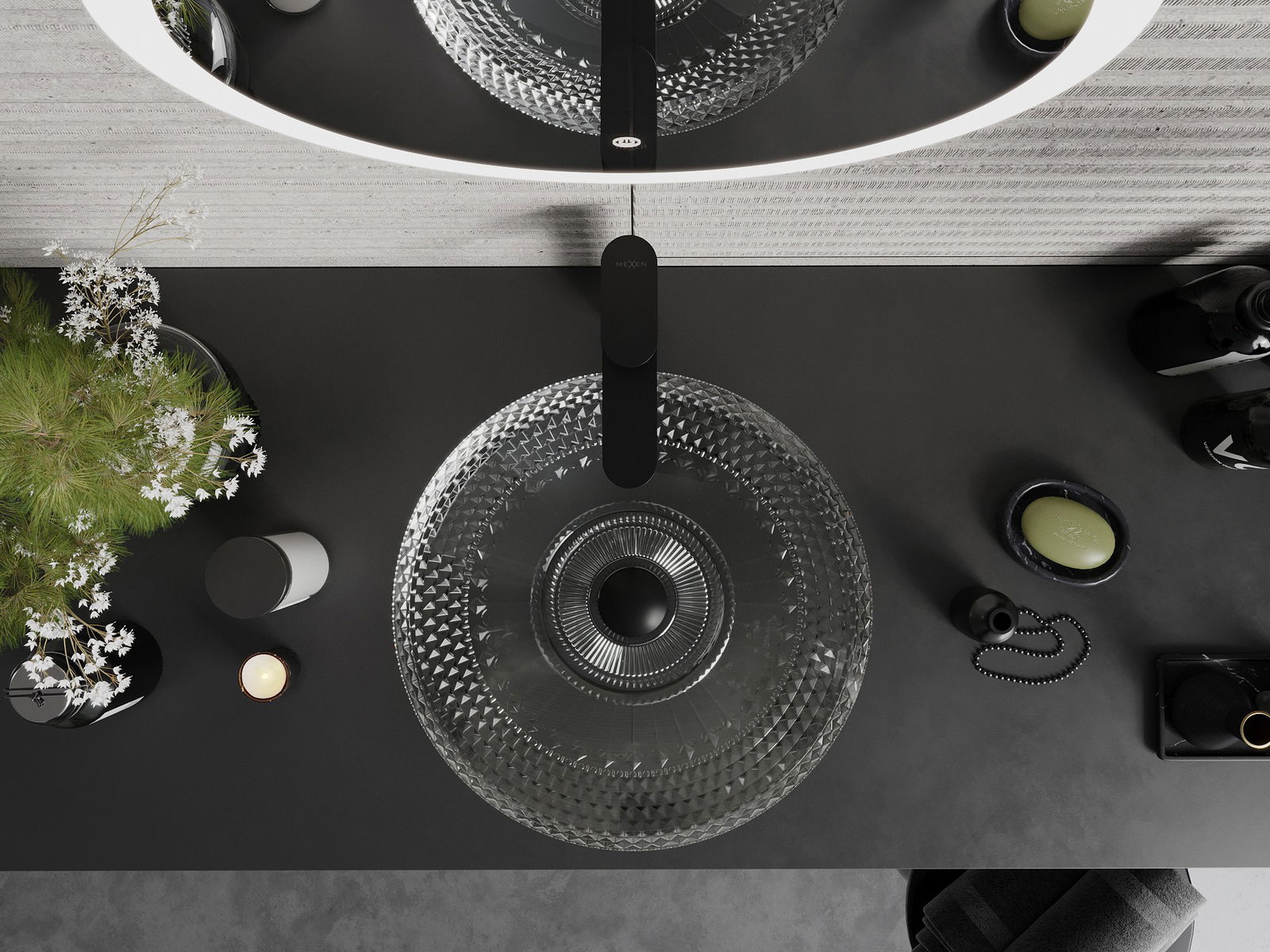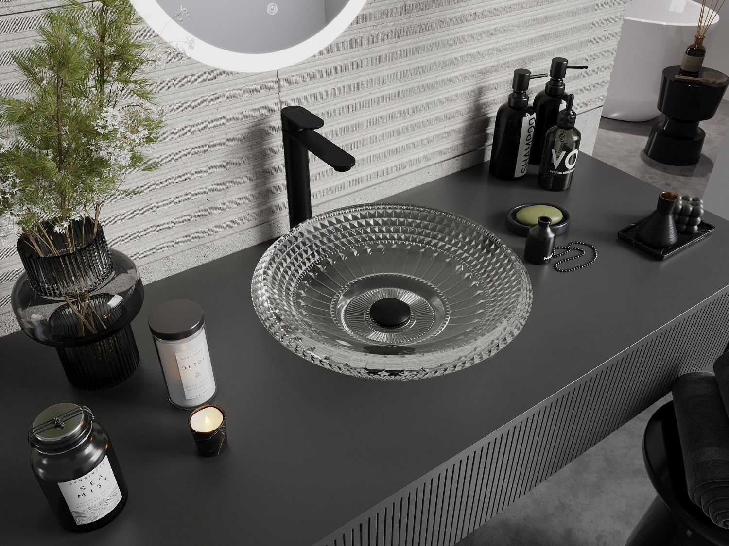 The washbasin features a unique crystal structure, giving it a distinctive and exceptionally striking appearance. The crystals shimmer in the light, catching the eye and adding elegance. A practical and stylish solution for any bathroom.