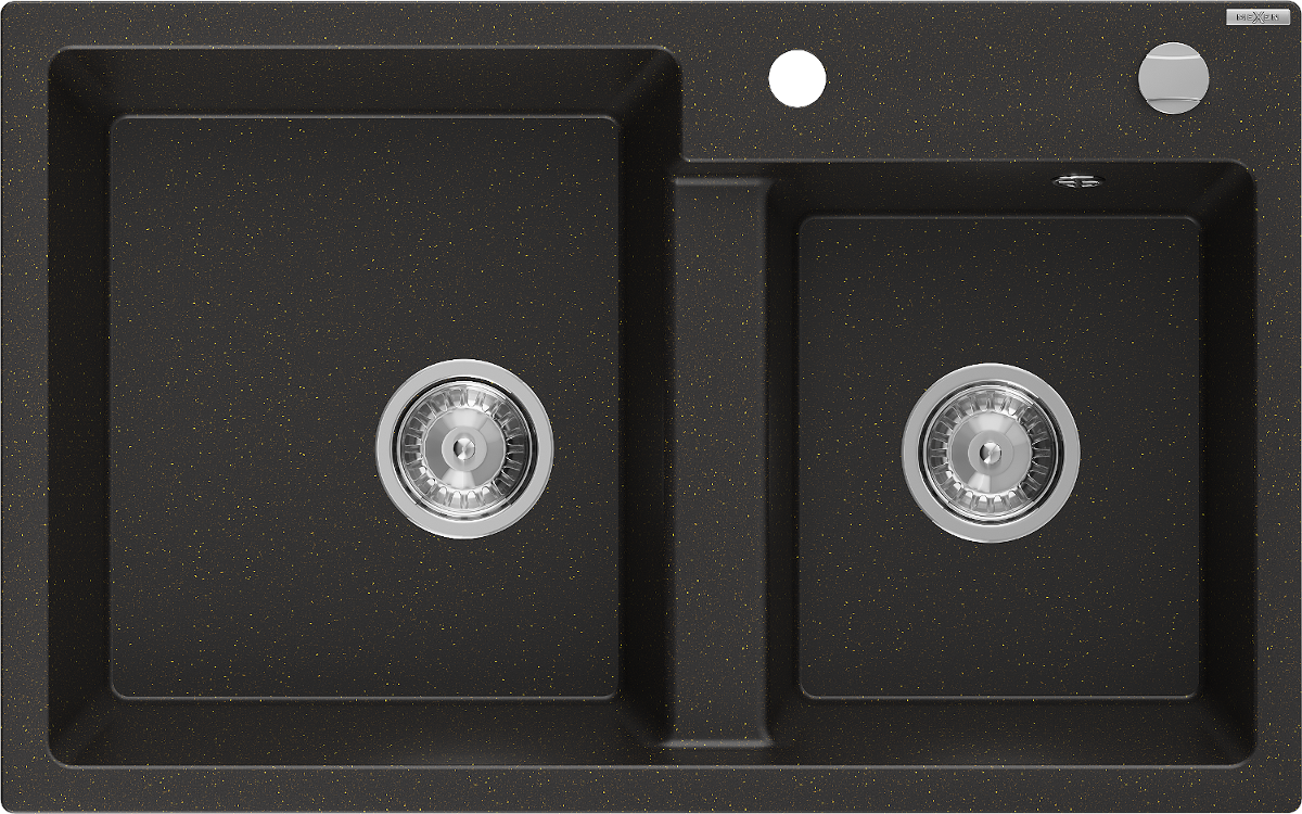 Mexen Tomas granite sink 2-bowl 800 x 500 mm, black/gold metallic, chrome siphon - 6516802000-75