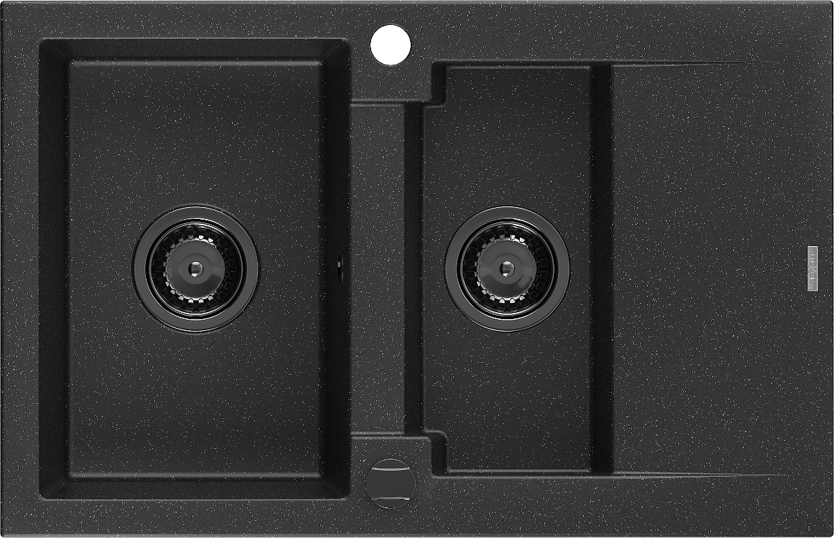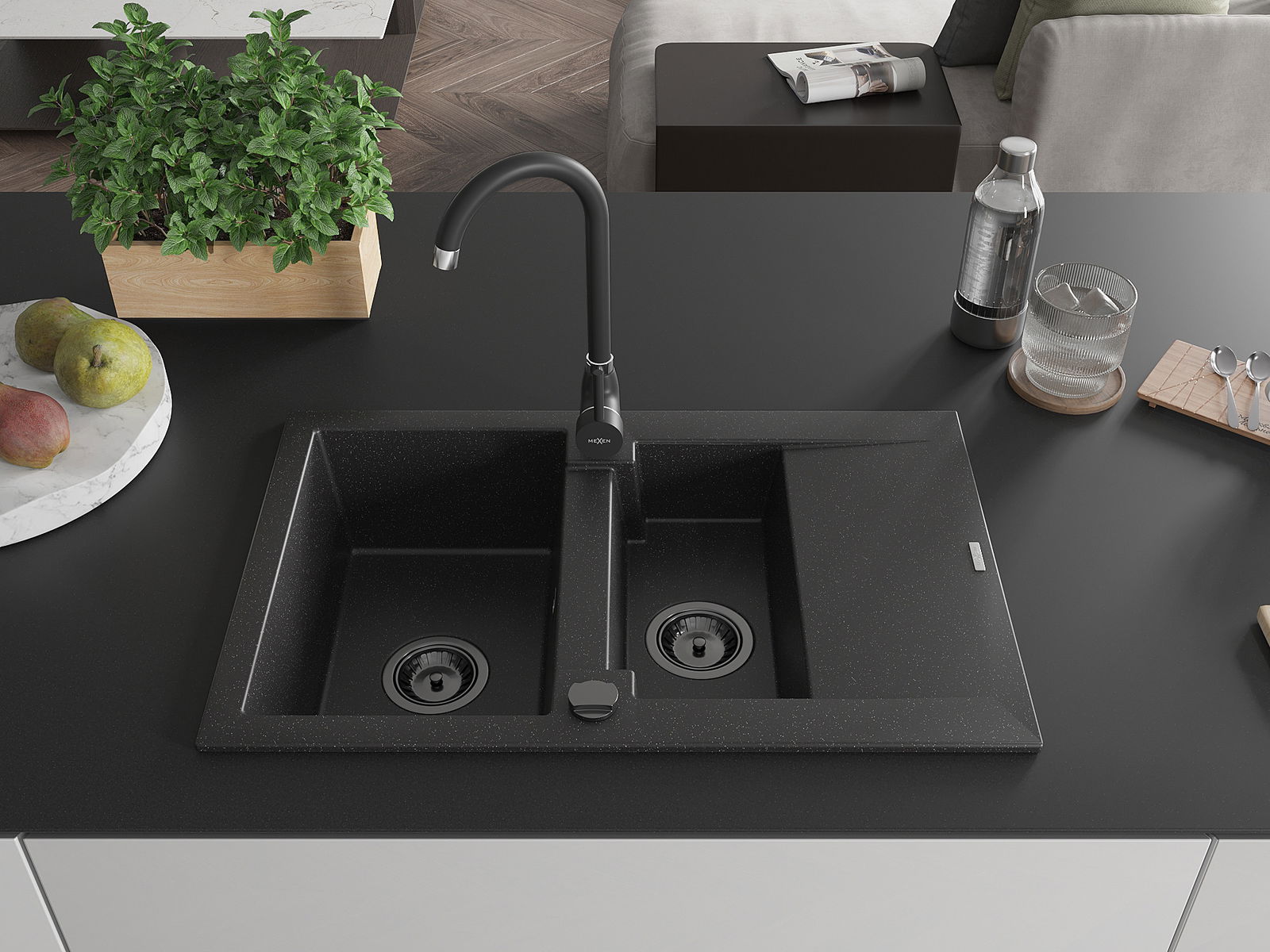 Mexen Gaspar granite sink 1.5-bowl with drainer 737 x 475 mm black/silver metallic, black siphon - 6507731505-73-B