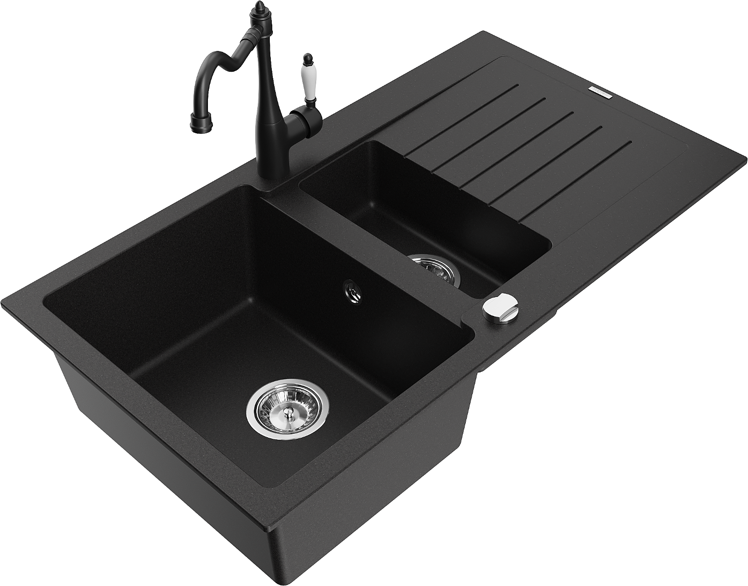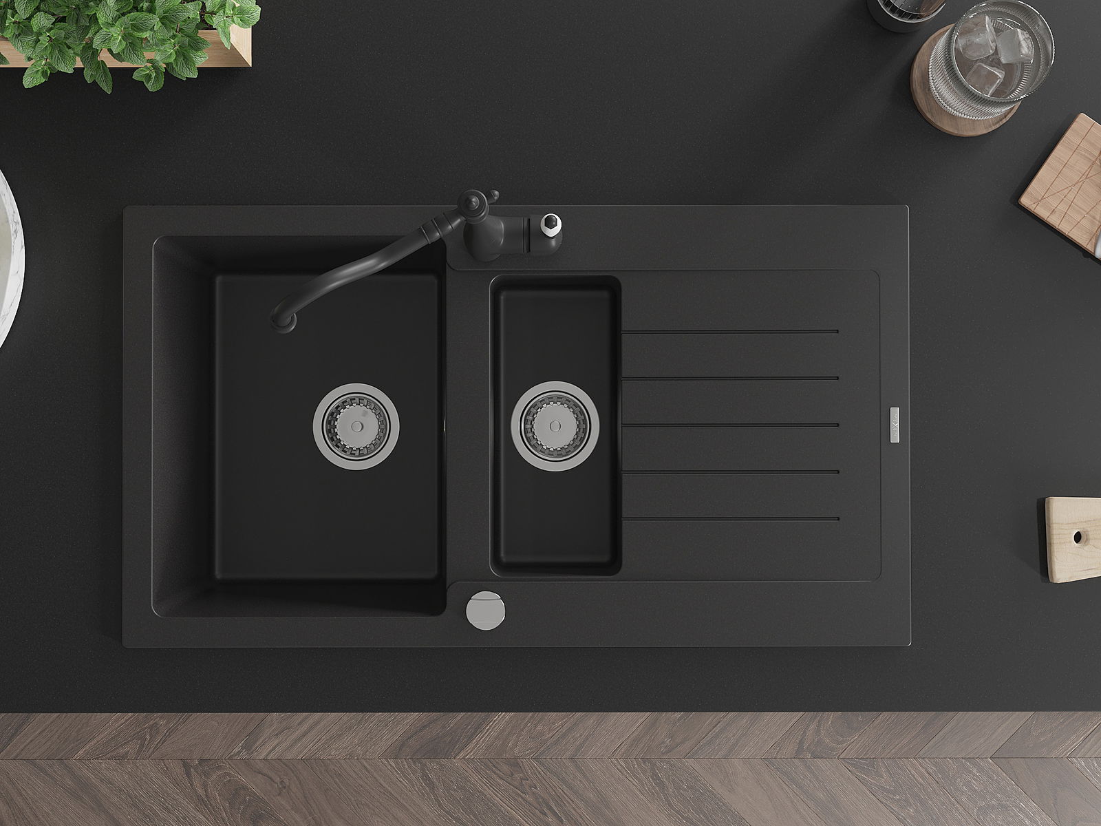 Mexen Matias granite sink 1.5-bowl with drainer and Carla kitchen tap, black - 6502-77-670700-70