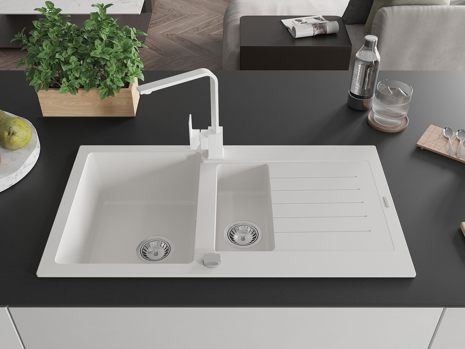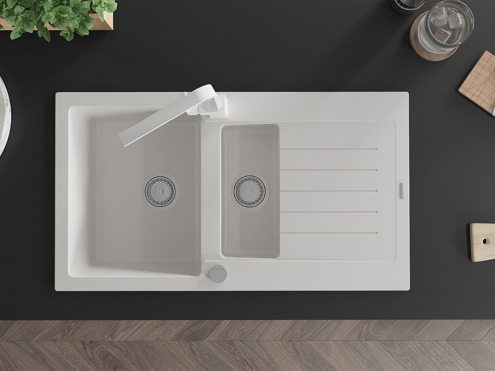 Choosing a sink with a draining board is a practical solution that allows you to set aside washed dishes or vegetables and fruits. The draining board makes daily cooking easier and helps maintain order in the kitchen.