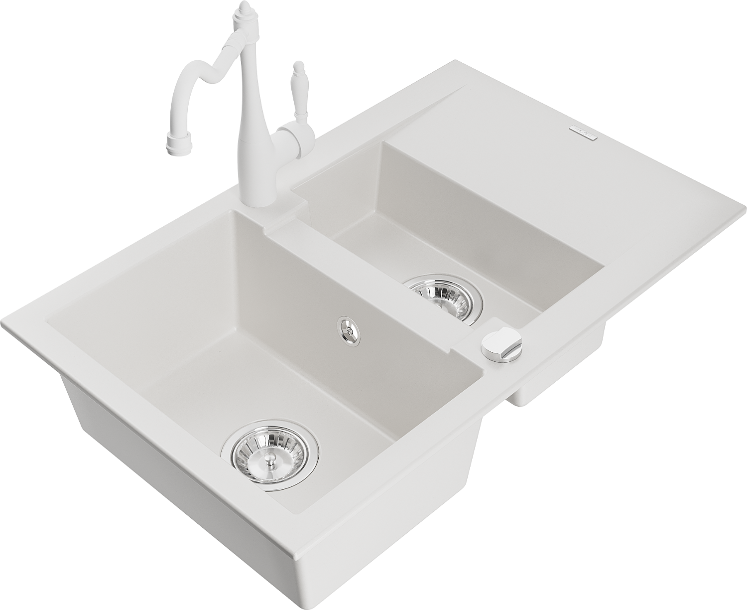 Mexen Gaspar granite sink 1.5-bowl with drainer and Carla kitchen tap, white - 6507-20-670700-20