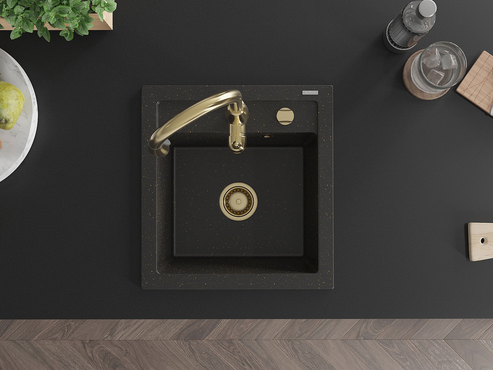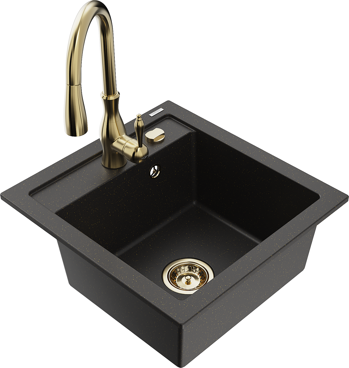 Mexen Vito granite sink 1-bowl with Savita kitchen tap, black/gold metallic - 6503-75-672601-50