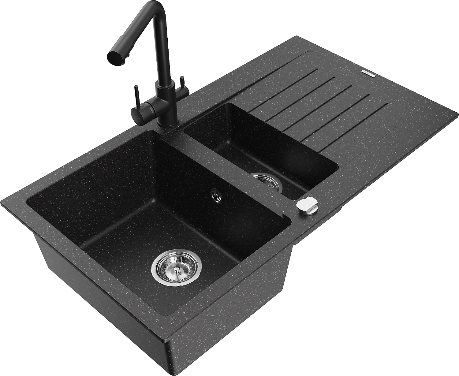 Mexen Matias granite sink 1.5-bowl with drainer and Duero kitchen tap, black/silver metallic- 6502-73-671600-70