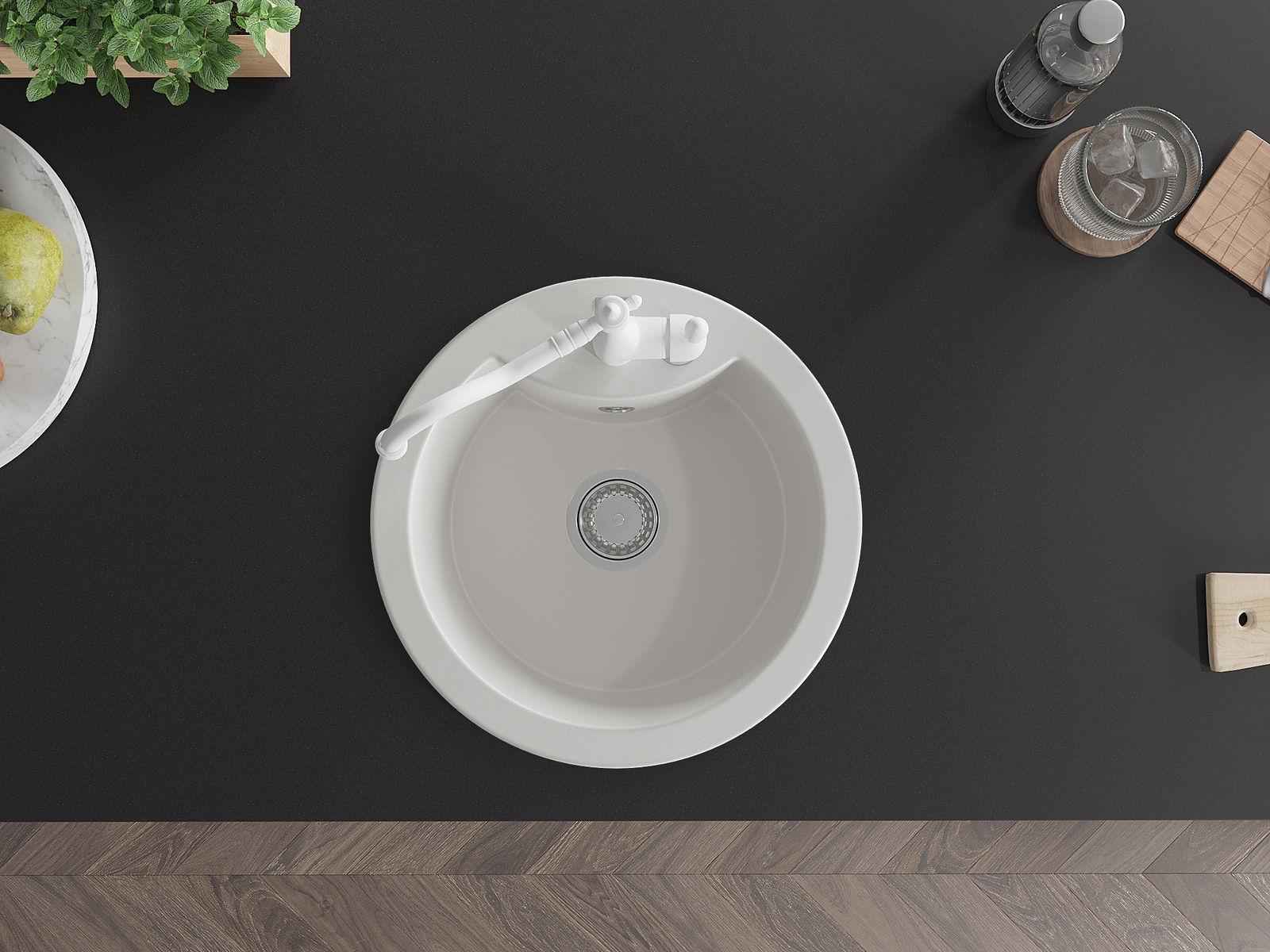 The surface of the sink is resistant to stains and discolouration, making it easy to maintain cleanliness and retain its colour for a long time of use. An aesthetic and practical addition to any kitchen.
