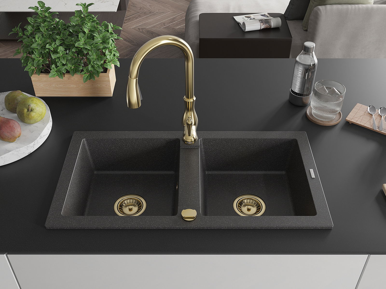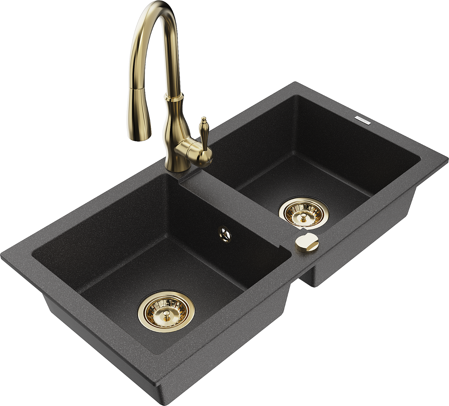 Mexen Mario 2-bowl granite sink with Savita kitchen tap, black speckled - 6504-76-672601-50