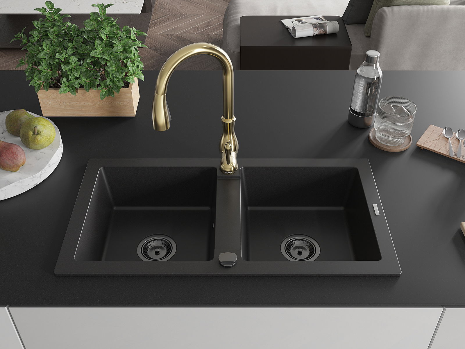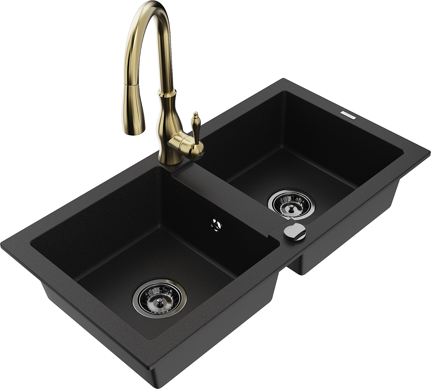 Mexen Mario granite sink with 2 bowls and Savita kitchen tap, black - 6504-77-672601-50-B