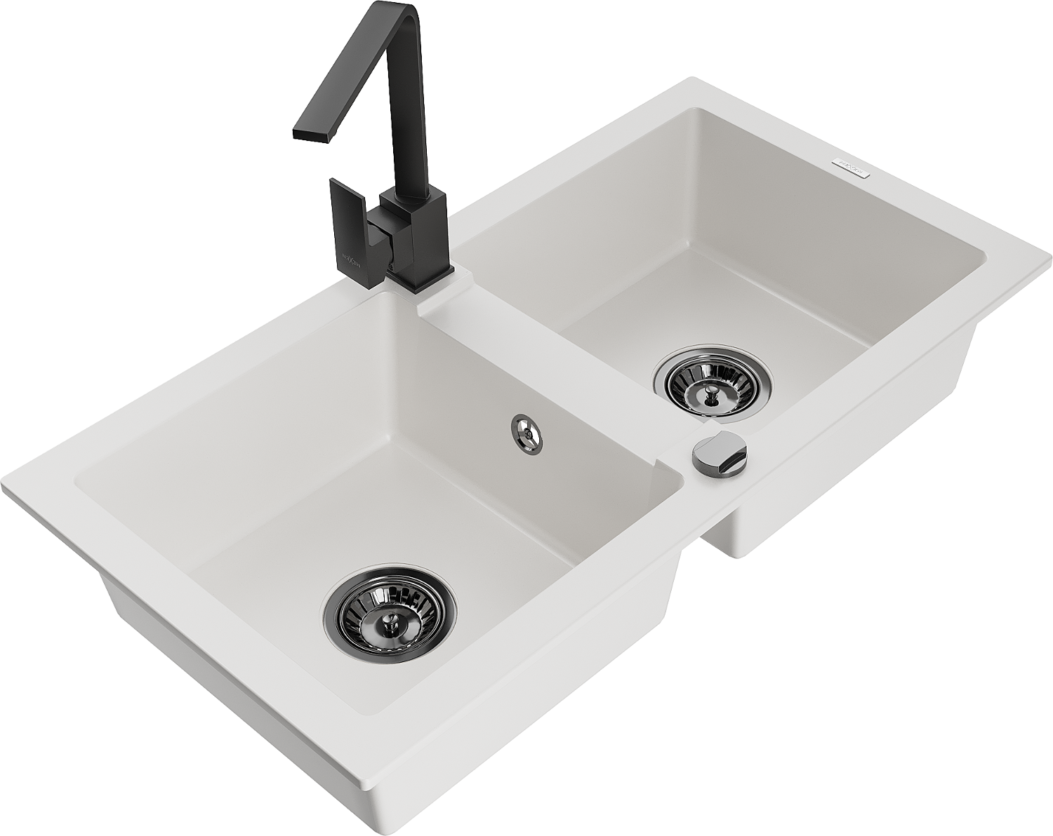 Mexen Mario granite sink 2-chamber with Rita kitchen tap, white - 6504-20-670300-70