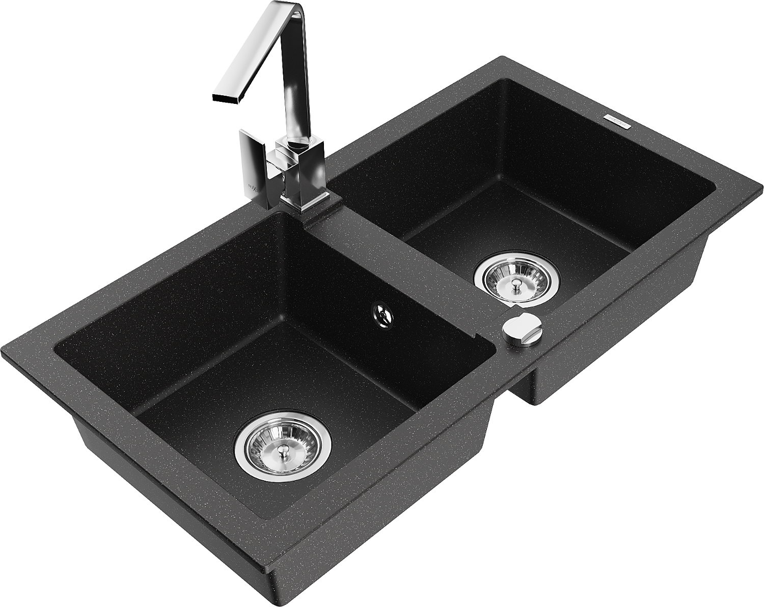Mexen Mario granite sink, 2-bowl with Rita kitchen tap, black/silver metallic - 6504-73-670300-00