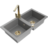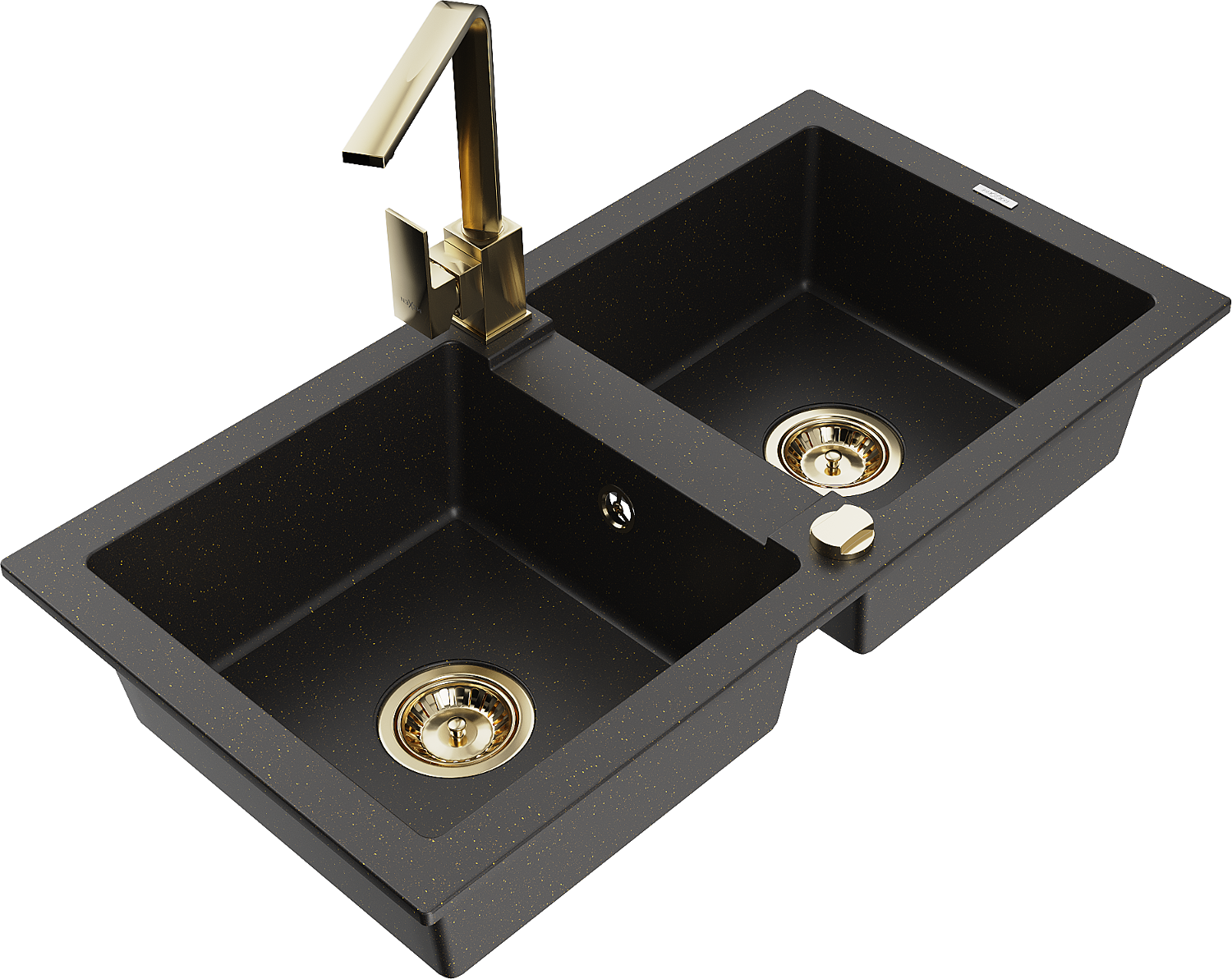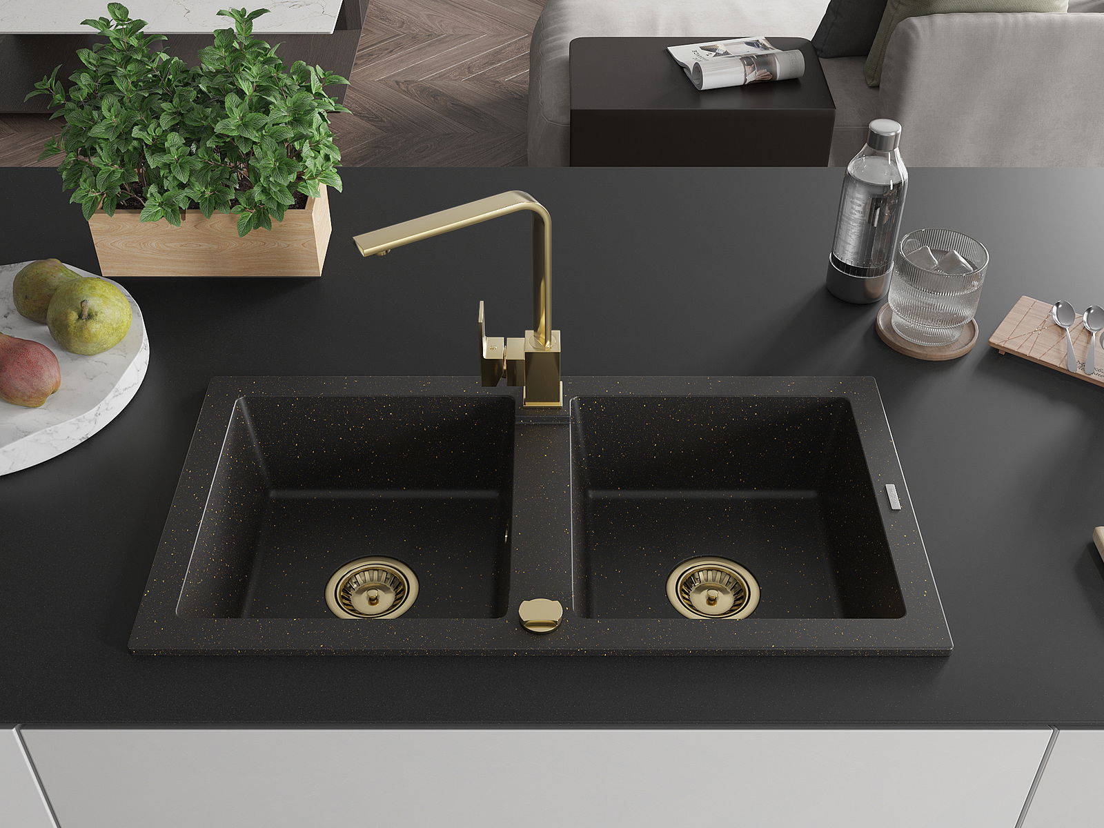 Mexen Mario 2-Bowl Granite Sink with Rita Kitchen Tap, Black/Gold Metallic - 6504-75-670300-50