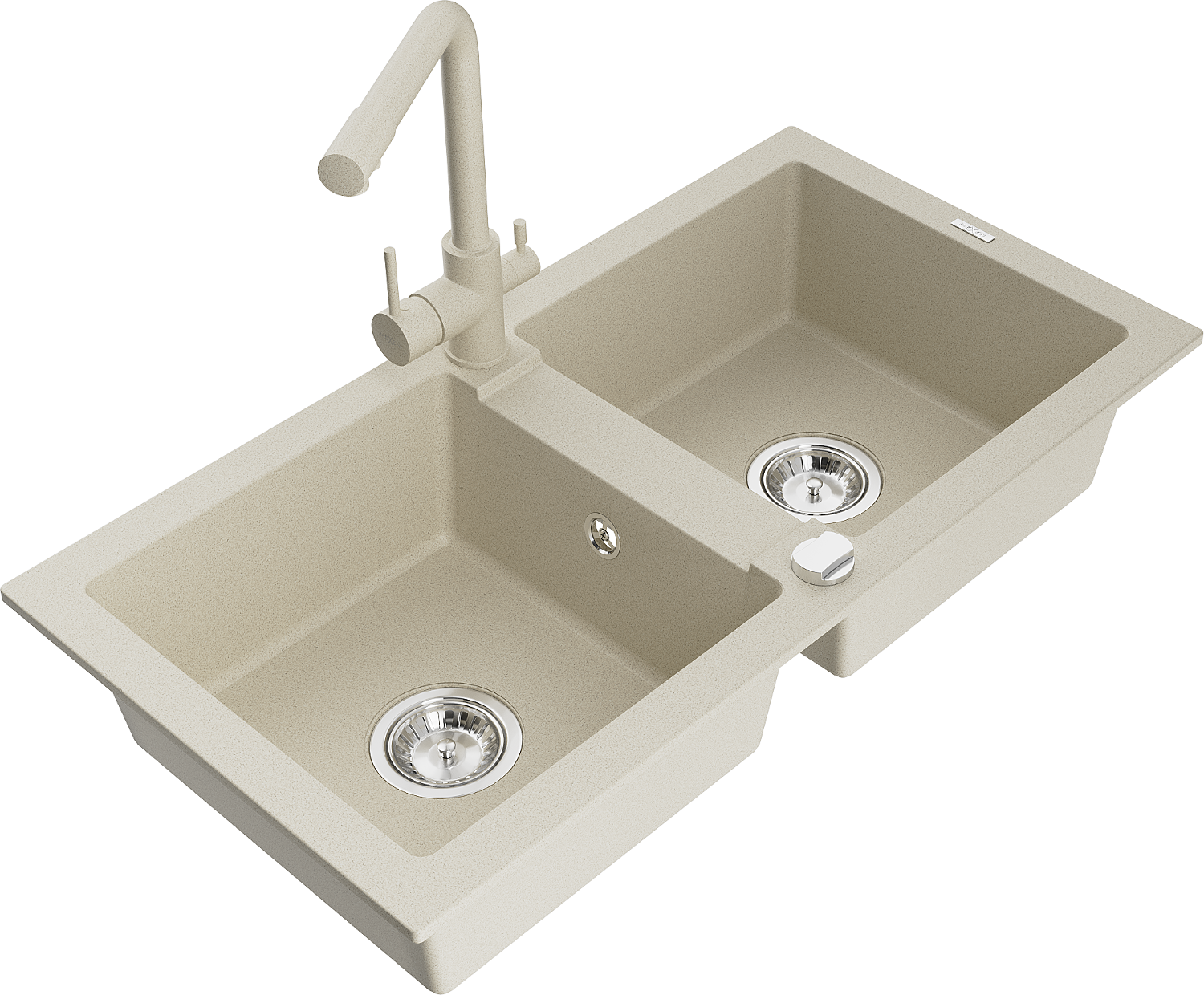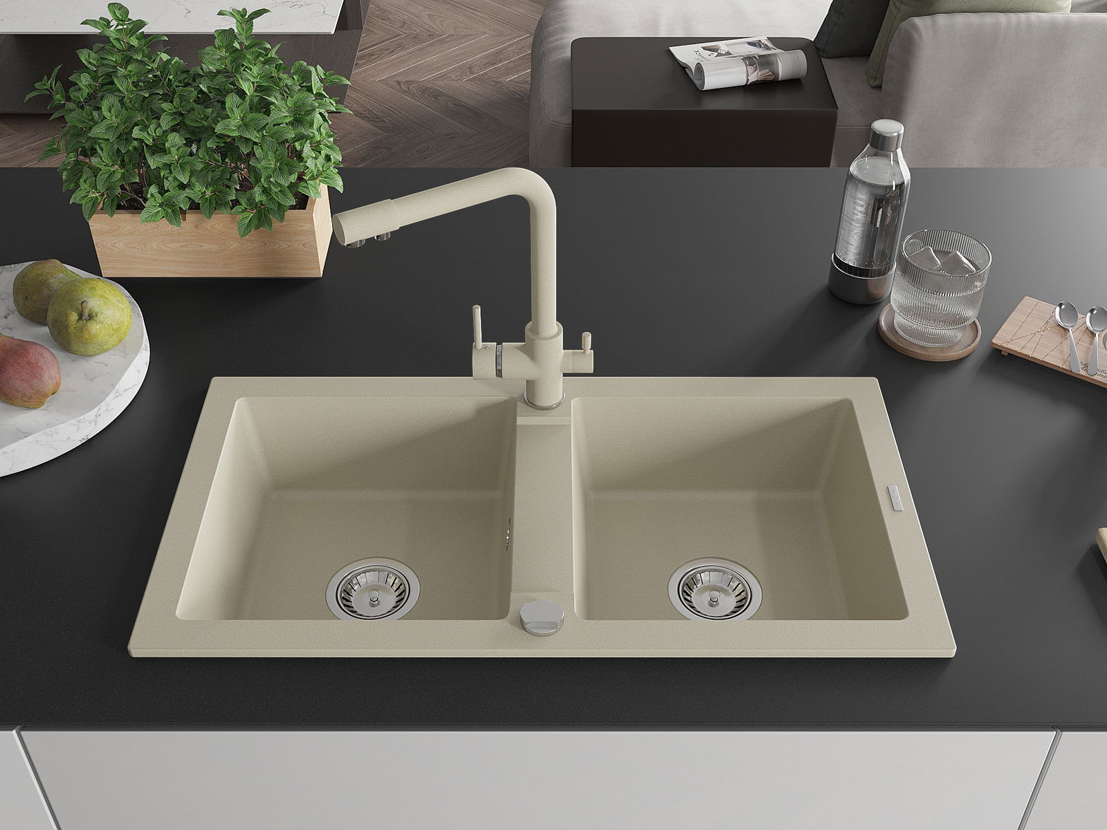 Mexen Mario granite double-bowl sink with Duero kitchen tap, beige - 6504-69-671600-69